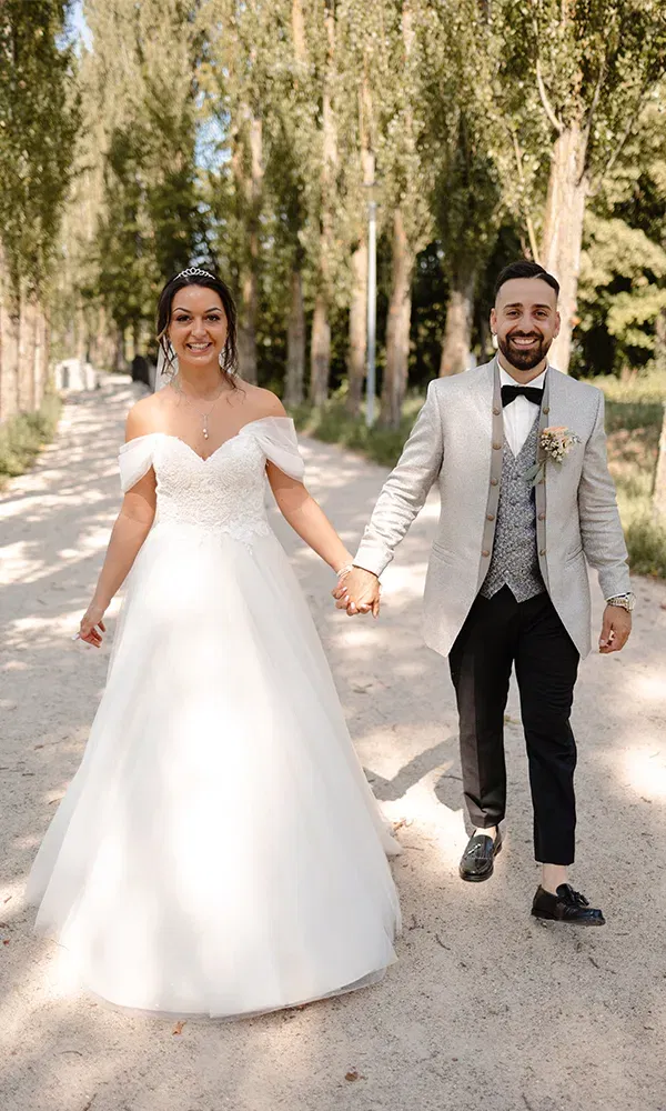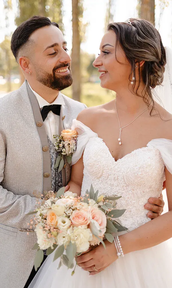 „Unser standesamtliches Jawort feierten wir mit 60 Gästen im Schönaicher Fürst in Böblingen. Da wir uns mit Deko nicht gut auskennen, besuchten wir den Showroom von ‚colorasa Event & Designs‘. Auf einem der Probetische fiel Davide Apricot ins Auge und er wusste sofort: Das ist es. Diese Farbe spiegelt uns wider. Um die Hauptfarbe herum entwickelten wir ein sommerlich-frisches Motto, denn wir lieben den Sommer, das Fröhliche und das Helle. Dekorateurin Julia Gawlik setzte unsere Wünsche super um. Die Farbe Apricot zeigte sich überall. Wichtig war uns auch, dass mit Deko-Elementen nicht übertrieben wird. Stattdessen setzten wir auf einzelne, tolle Highlights wie ein Willkommensschild. Der fröhliche, helle Stil spiegelte uns perfekt wider.“