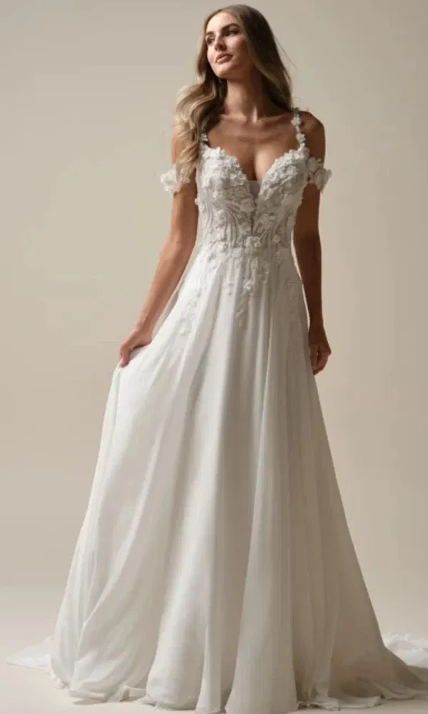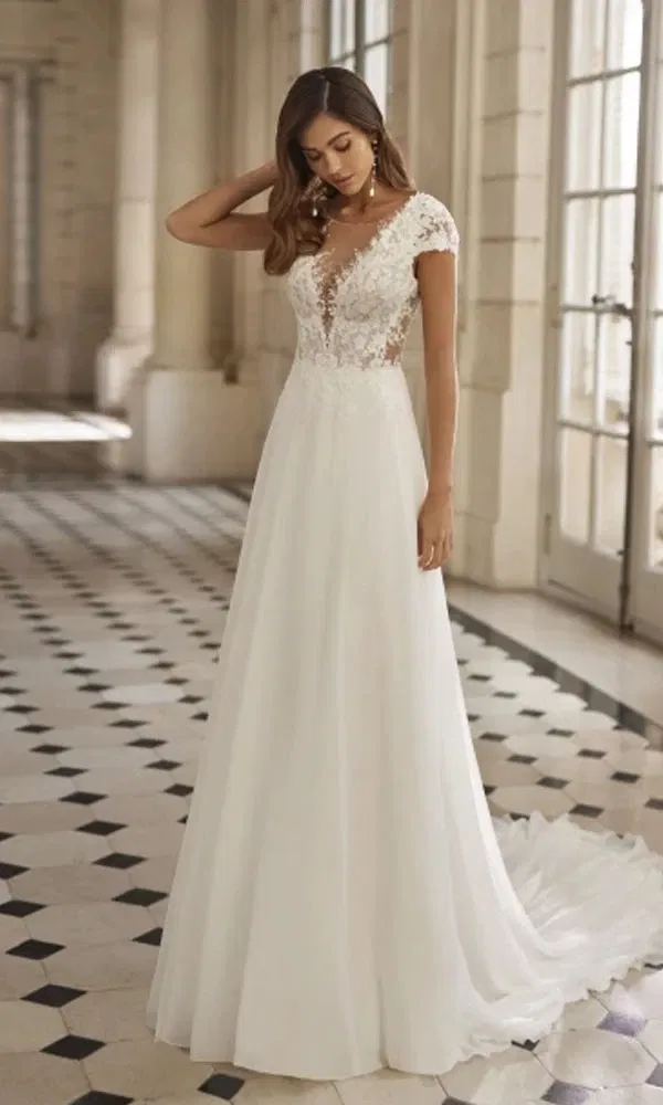Für Bräute mit einer birnenförmigen Figur ist das A-Linien-Kleid wie gemacht! Der sanft ausgestellte Rock umschmeichelt die Hüften, ohne zusätzliches Volumen zu erzeugen – so bleibt das Gesamtbild schön ausbalanciert. Das Ergebnis? Ein eleganter Look, der deine natürlichen Rundungen perfekt betont!