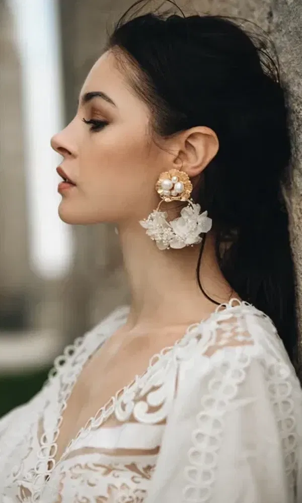 Romantische Schleier mit floralen Details feiern ihr Comeback – ob mit zarter Stickerei, feiner Spitze oder auffälligen 3D-Blumen. Auch Haarbänder mit (3D-)Blüten setzen ein modisches Statement: von verspielten Flower Crowns für Boho-Bräute bis hin zu auffälligen Designs aus Filz oder Leder – alles ist erlaubt.