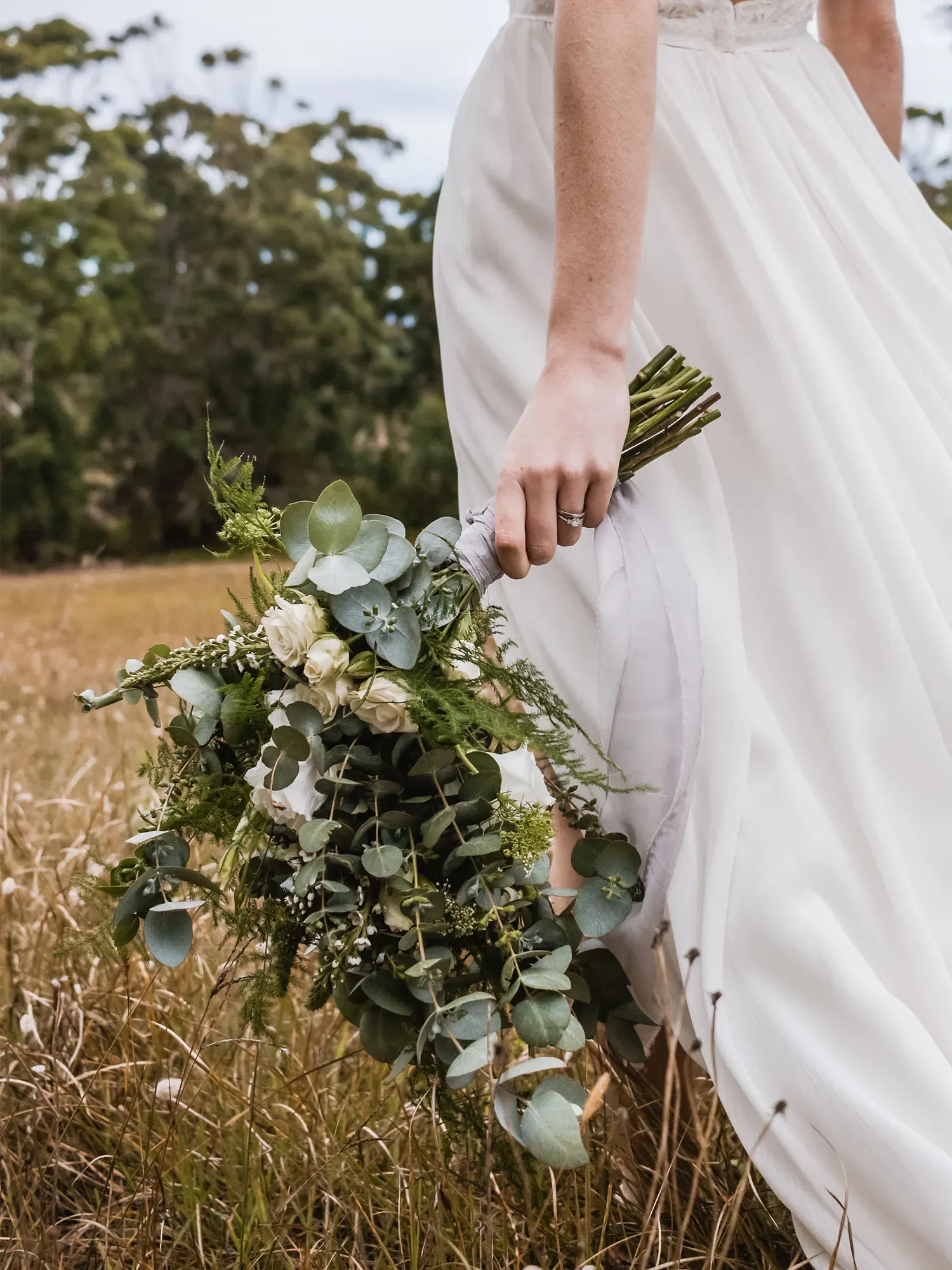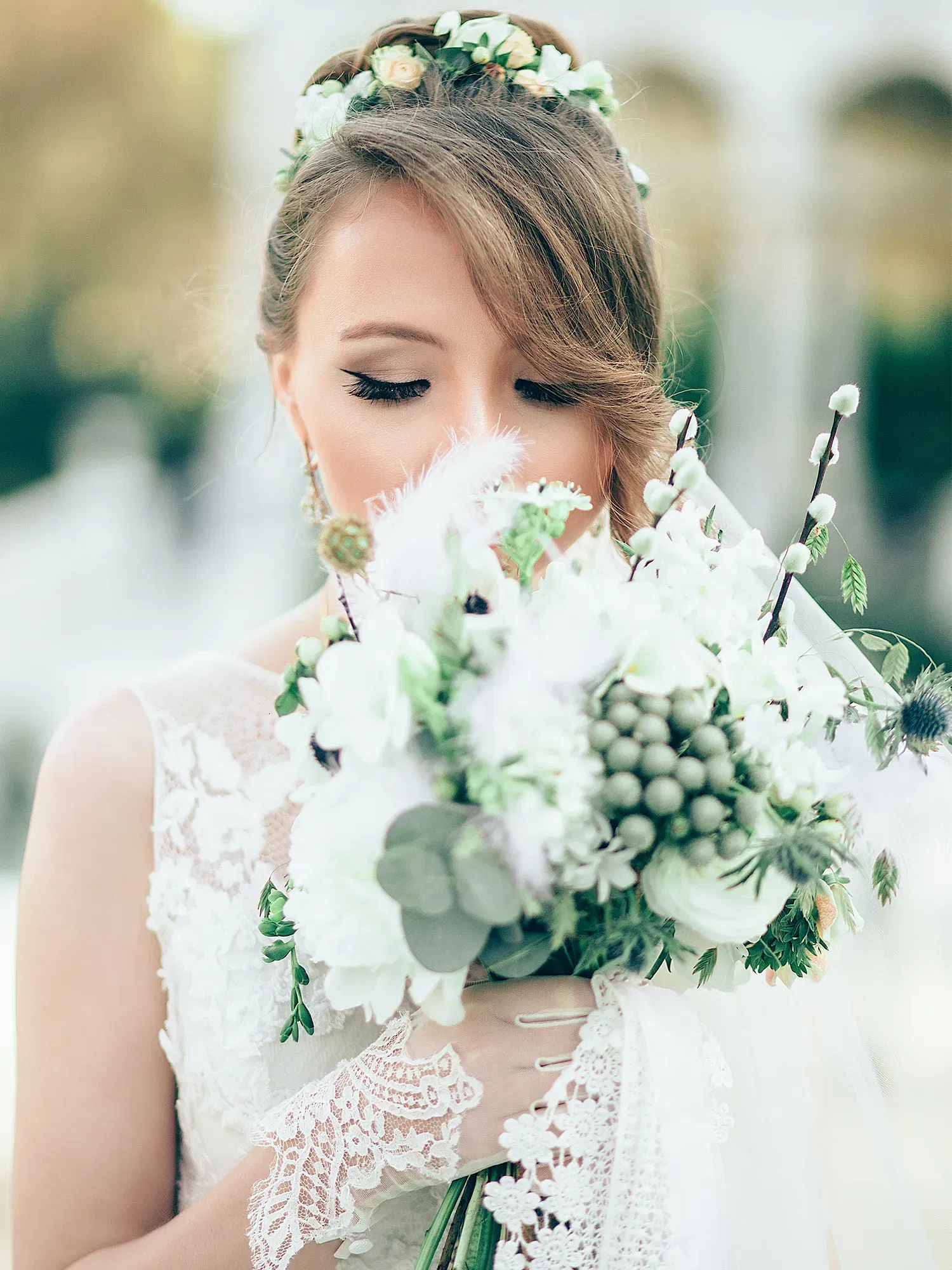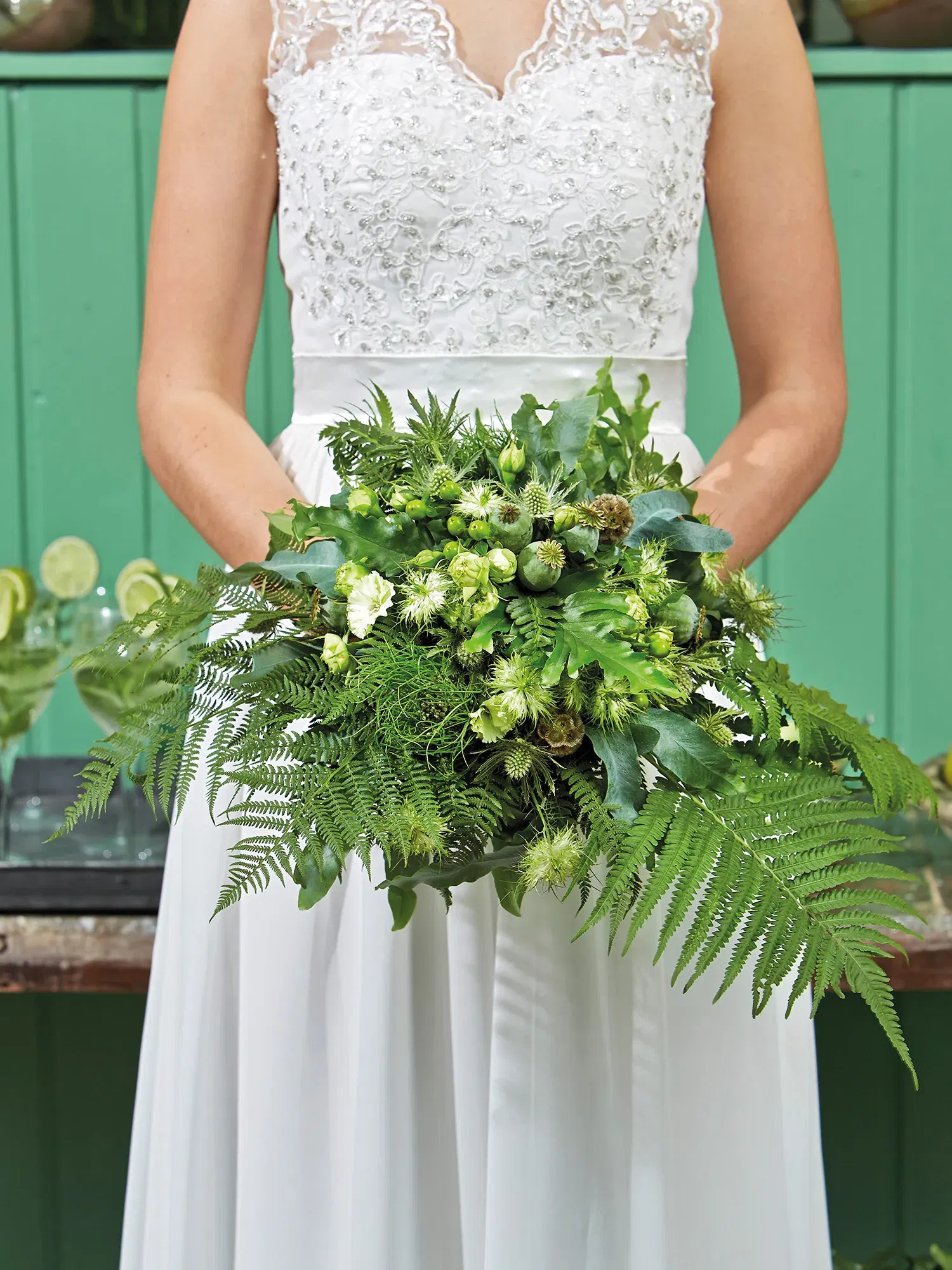 Ein Strauß aus grünen Zweigen bietet den perfekten Kontrast zu einem weißen Hochzeitskleid. Minzenblätter, Eukalyptus, Farnenblätter und satt grüne Andromeda-Ranken zaubern einen wunderschönen Brautstrauß. Perfekt für Wald- oder Outdoorhochzeiten in freier Natur. Der Strauß im Greenery-Look ist außerdem sehr langlebig und einzigartig. Wer noch auf der Suche nach nachhaltigen Konfetti ist, der kann auch auf Waldsträucher und Pflanzen, wie beispielsweise Farn, zurückgreifen.