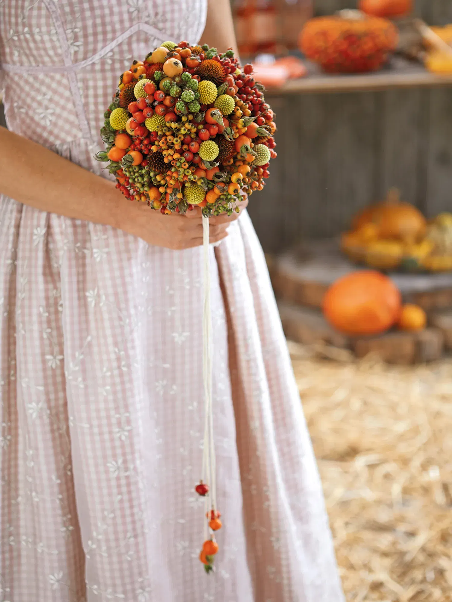 Ein echter Augenschmaus! Aus verschiedenen Obstsorten wird ein buntes Farbenspiel. Das meist extra für den Brautstrauß gezüchtete Obst, verleiht deiner Herbsthochzeit einen verspielten und farbenfrohen Touch. Da es sich hier um Zierobst handelt, werden keine Lebensmittel für eure Hochzeitsblumen verschwendet.