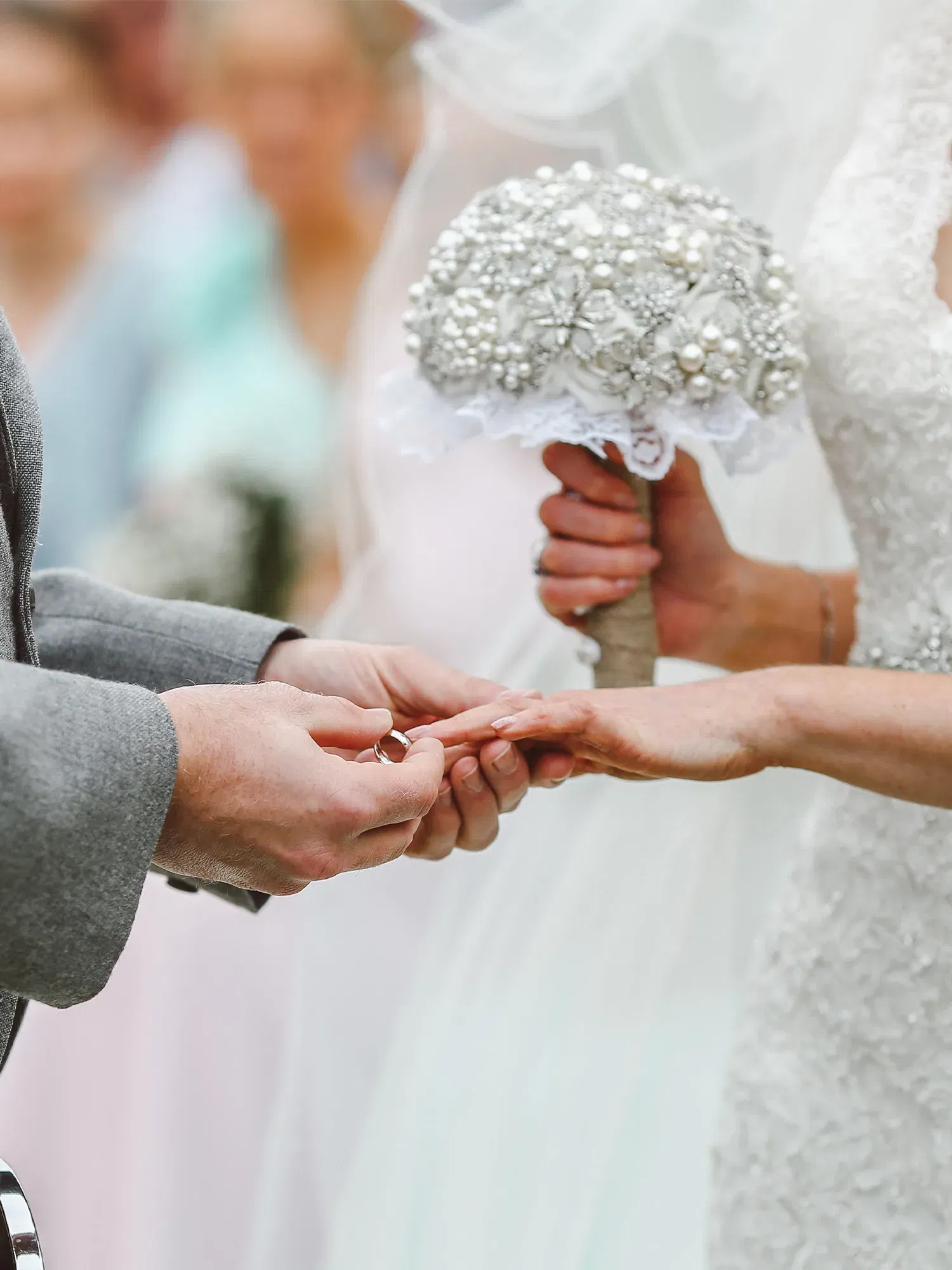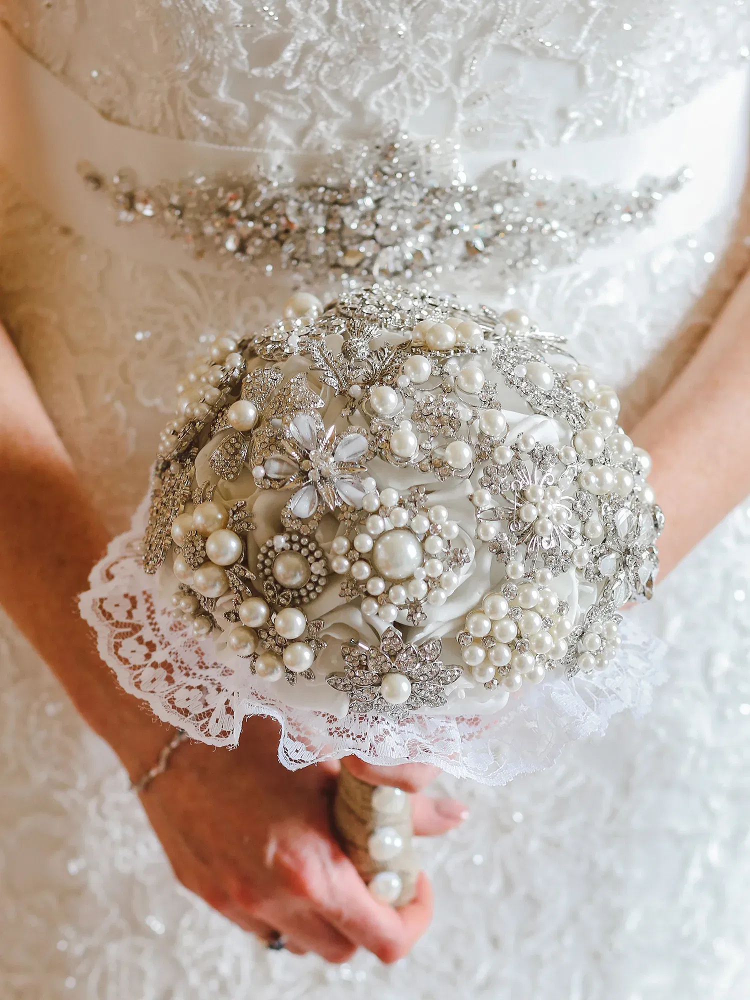 Perlen und Broschen bedecken die Oberfläche des Straußes: so gelingt eine verspielte Brautstrauß-Alternative. Damit die Broschen und Perlen halten, müssen sie an künstlichen Blumen befestigt werden. Nach der Hochzeit könnt ihr den Strauß dann weiterverarbeiten und Deko-Elemente basteln, die euch ewig an den Tag erinnern.