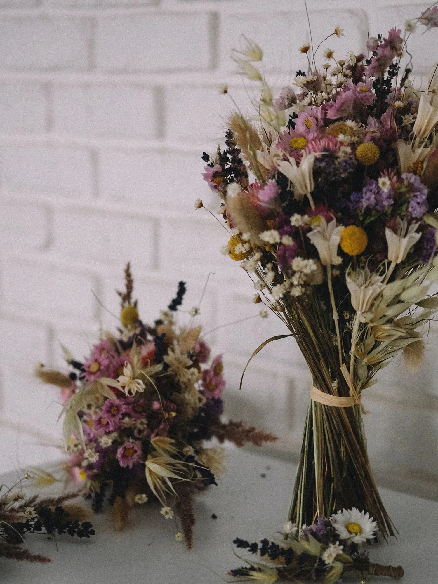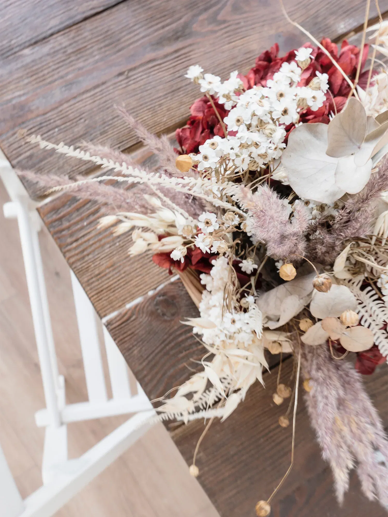 Trockenblumen sind die perfekte florale Deko auf einer Hochzeit in Boho-Stil. Zusammen mit getrocknetem Grün und Zweigen lassen sie sich perfekt zu einem schönen Brautstrauß zusammenbinden. Ein großer Vorteil: Der Strauß aus Trockenblumen wird das frisch vermählte Paar auch noch in vielen Jahren an den schönen Tag zurückerinnern.