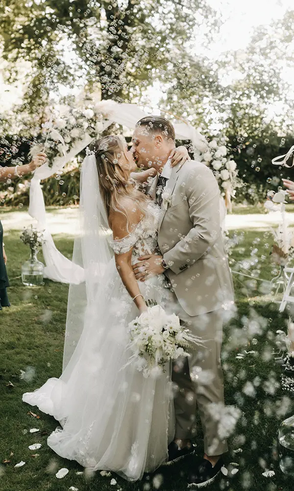 - Perspektivenwechsel: Normalerweise sitzt das Paar während der Zeremonie. Bei besonderen Programmpunkten wie dem Kuss steht ihr auf und stellt auch mittig vor eure Gäste. So bekommen nicht nur eure Liebsten, sondern auch ihr eine andere Perspektive auf diesen wundervollen Moment.