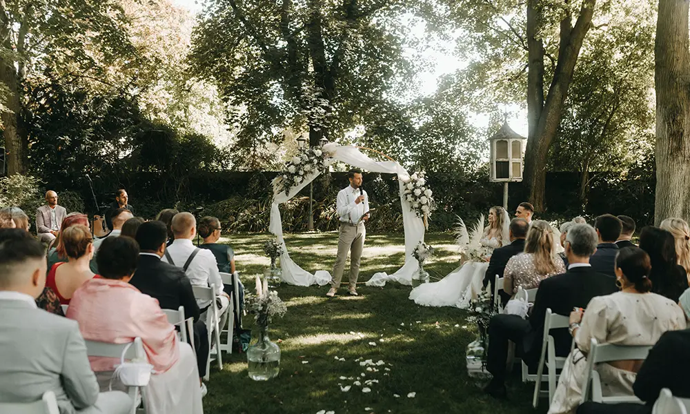 - Setting: Zwischen euch und eurem Trauredner oder eurer Traurednerin sollten keine Notenständer, große Notizzettel oder ähnliches stehen. Das schafft Barrieren. Die Gäste sollen ungestört die Emotionen des Paares/Redners/Rednerin einfangen können.