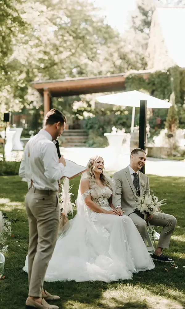 „Ein kurzer Ablaufplan für die Trauung mit den für euch wichtigsten Punkten ist eine super Idee. Trotzdem sollte das Gespräch vor allem echt und spontan sein. Nur so kann man sich gegenseitig ungefiltert kennenlernen und den einzigartigen Vibe der Beziehung einfangen. Wir machen nicht irgendwas als RednerInnen da vorne, jedes Wort muss passen.“