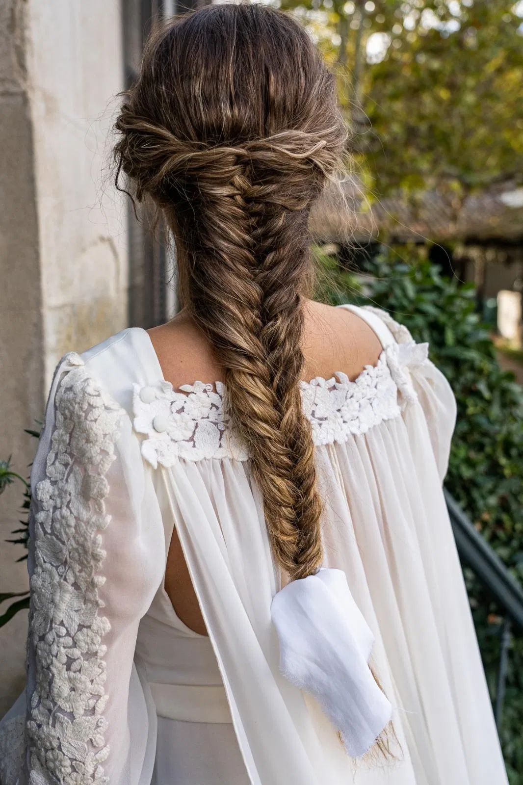 Der aufwendig gearbeitete Fischgrätenzopf zieht alle Blicke auf sich und strahlt eine Mischung aus Eleganz und Natürlichkeit aus. Die locker geflochtene Struktur bringt Bewegung und Volumen ins Haar, ohne an Leichtigkeit zu verlieren. Ein schlichtes Stoffband am Ende sorgt für einen unerwarteten Akzent. Diese Frisur passt perfekt zu luftig-leichten Outdoor-Hochzeiten.
