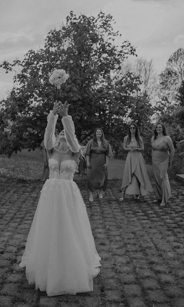 Für Clara-Luise und Tobias war der Einzug zur Trauung der wohl berührendste Moment ihres Hochzeitstages. Während die Band „Book of Love“ spielte, wartete Tobias mit den gemeinsamen Zwillingen am Traubogen, als Clara von ihrem Vater zum Altar geführt wurde – ein Augenblick voller Emotionen. Dann stand das Paar allein vor dem Traubogen, als plötzlich Claras Bruder aufstand und die Traurede begann. Dass er die freie Trauung durchführte, war eine liebevolle Überraschung, die niemanden unberührt ließ. Kein Auge blieb trocken und für Clara und Tobias war es genau so, wie es sein sollte: persönlich, authentisch und unvergesslich.