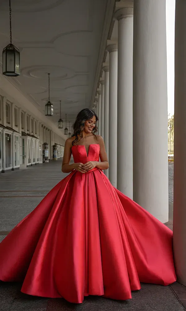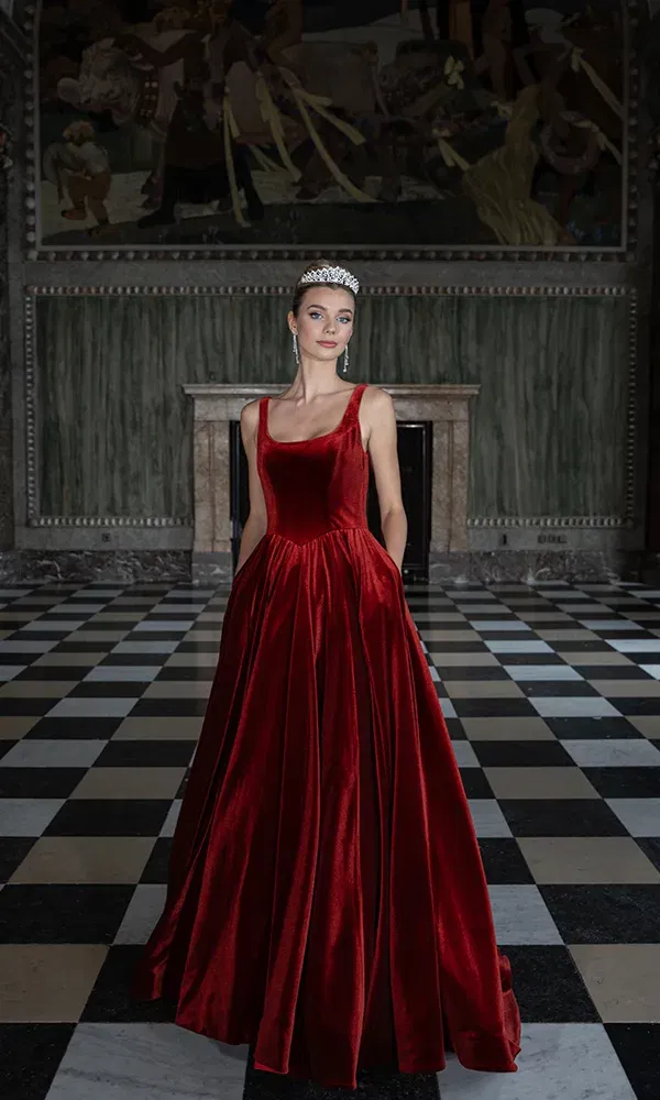 Wie im Märchen heiraten? Nichts leichter als das! Das Modell aus burgunderrotem Samt verströmt die verträumte Romantik vergangener Epochen und passt, dank seiner schnörkellosen Linie, dennoch perfekt in unsere Zeit.
