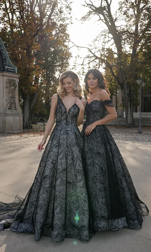 Wer sagt, dass Frau nur in hellen Farben ja sagen kann? Die beiden Modelle aus besticktem schwarzem Tüll der De Luxe Kollektion – eins mit V-, das andere mit Carmen-Ausschnitt –