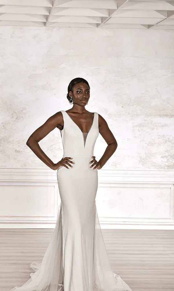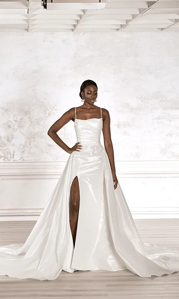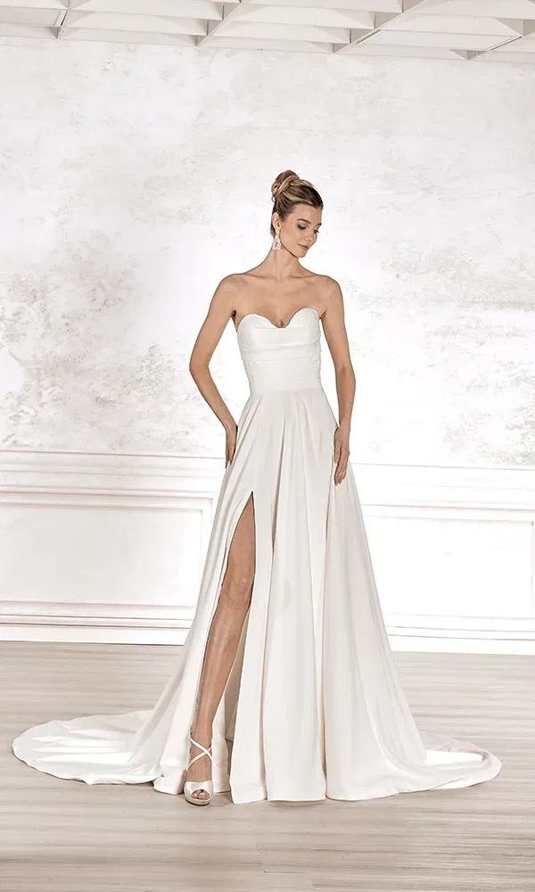 Statt auf viel Bling-Bling, setzt dieses Modell aus der Kollektion Pearl auf Drapage-Effekte und Faltenwurf. Eine fein konturierte Korsage und ein locker fallender Rock mit Beinschlitz schmeicheln der Figur und lassen Raum für auffällige Accessoires.