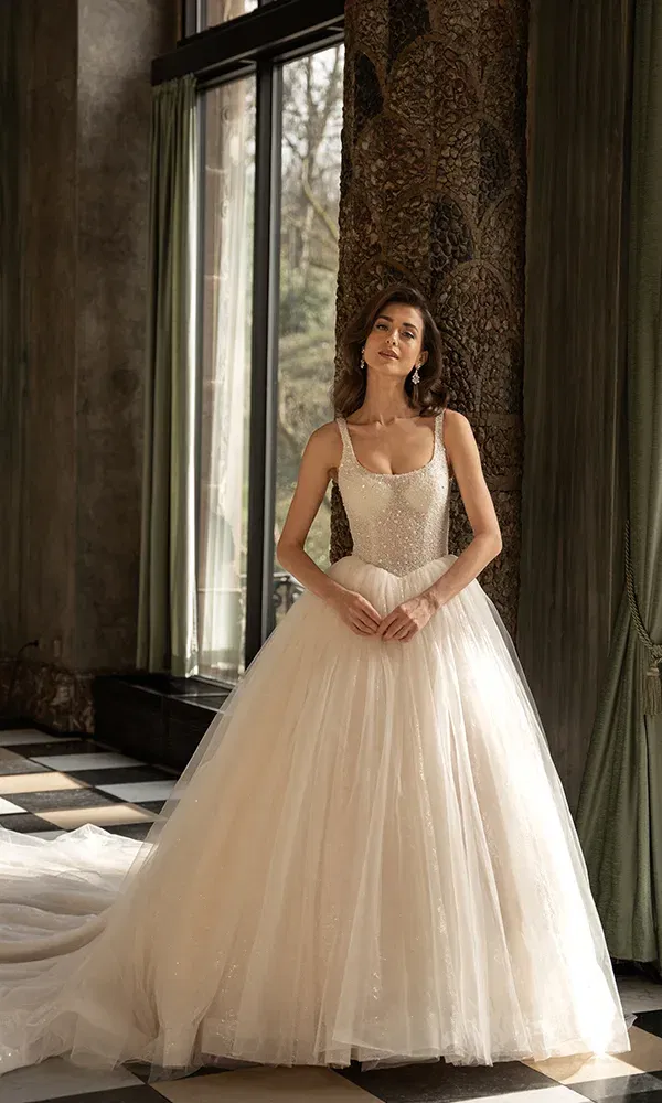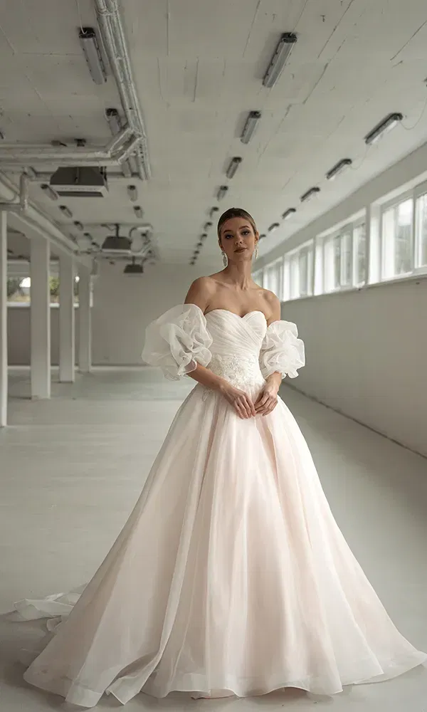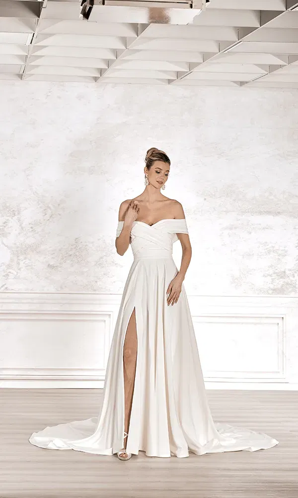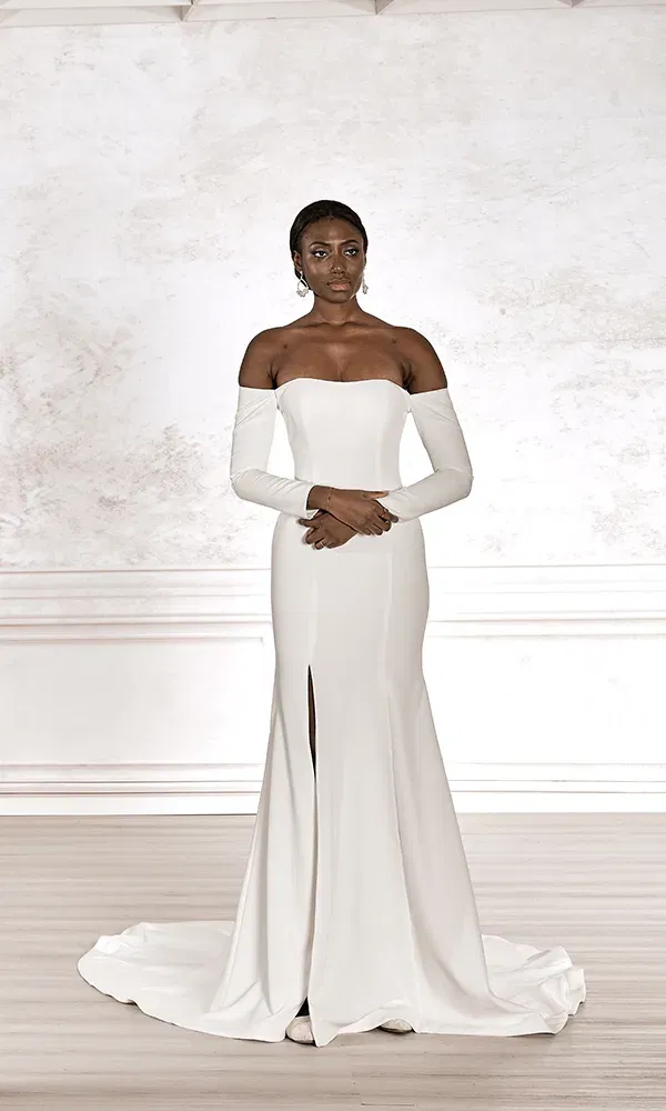Fast wie eine weiße Leinwand betont dieses schulterfreie Modell das Kunstwerk, um das es eigentlich geht. Für Bräute, die nicht mit ihrem Kleid konkurrieren, aber trotzdem einen atemberaubenden Auftritt hinlegen möchten.