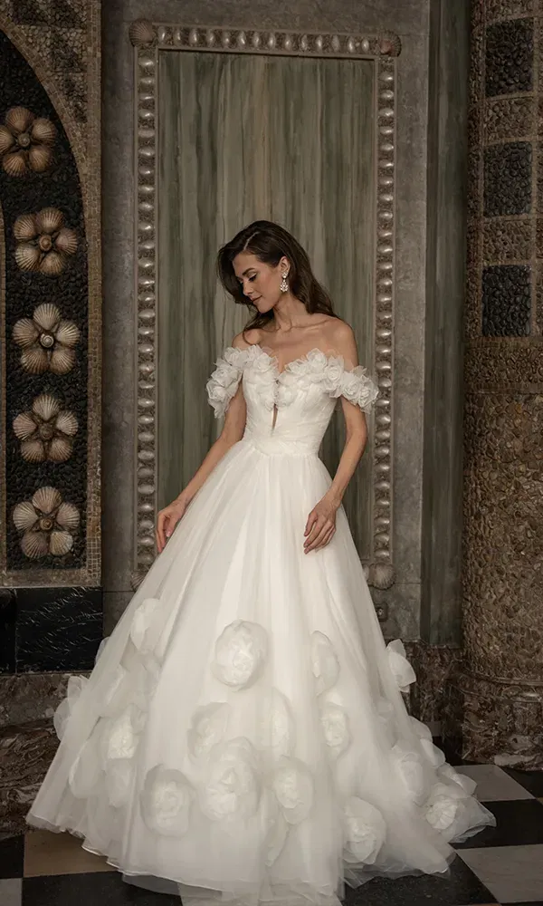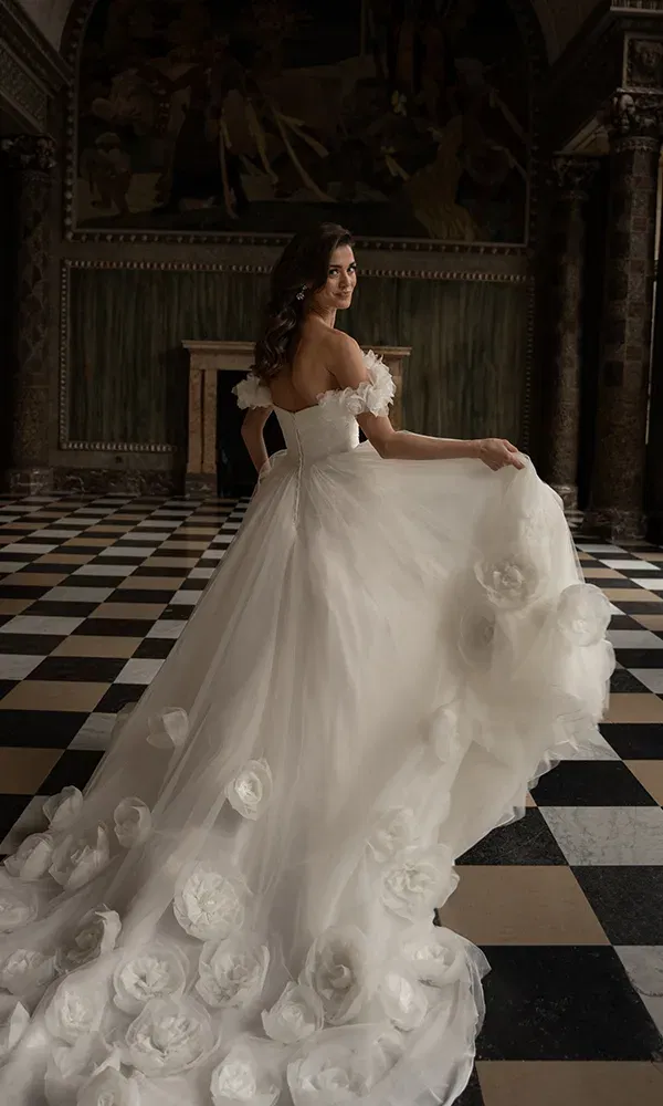 Ein Band aus zarten Tüll-Rosen ersetzt beim Kleid ‚Daisy‘ gewöhnliche Off-Shoulder-Träger und verhüllt auf verführerische, aber elegante Weise, was darunter liegt. Der florale 3D-Effekt setzt sich bei dieser Robe auch auf Rock und Schleppe fort. Romantik, neu definiert.