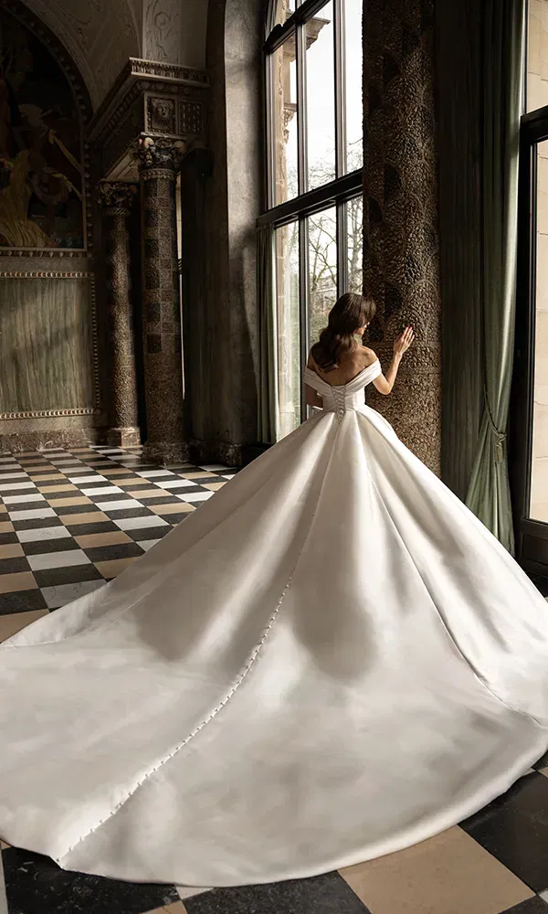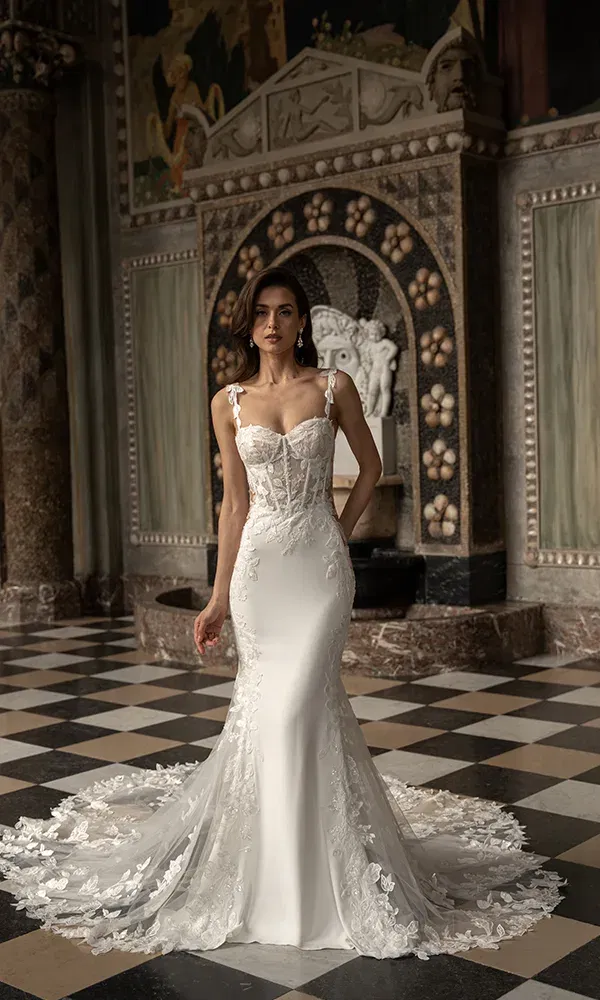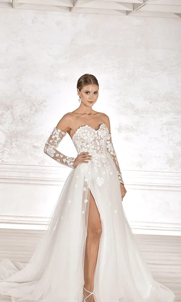 Wer von einem durch und durch hochzeitlichen Look träumt, dürfte beim Anblick von ‚Estelle‘ um Atem ringen. Florale Ärmel, ein sinnliches Rücken-Dekolleté und eine sanft schimmernde, spitzenbesetzte Schleppe verkörpern alles, was eine traditionelle, aber aufsehenerregende Kleiderwahl ausmacht.