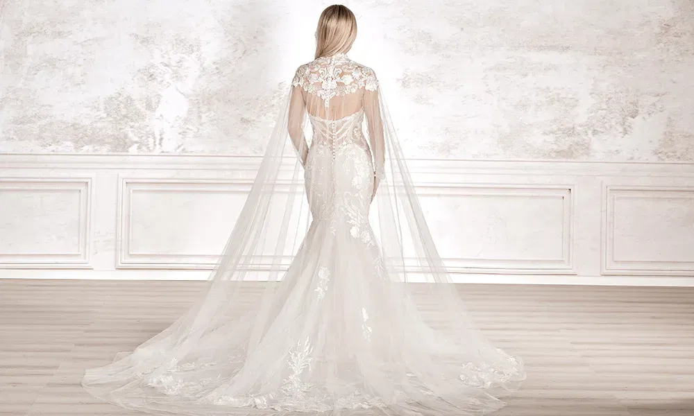 Ein hauchzartes, spitzenverziertes Cape, das sich in Sekundenschnelle an- und ausziehen lässt, verleiht dem Mermaid-Dress darunter Eleganz und 3-Dimensionalität. Ideal für zierliche Bräute, aber auch um Schultern und Rücken während der kirchlichen Trauung zu verhüllen und bei der Feier am Abend mehr Haut zu zeigen.