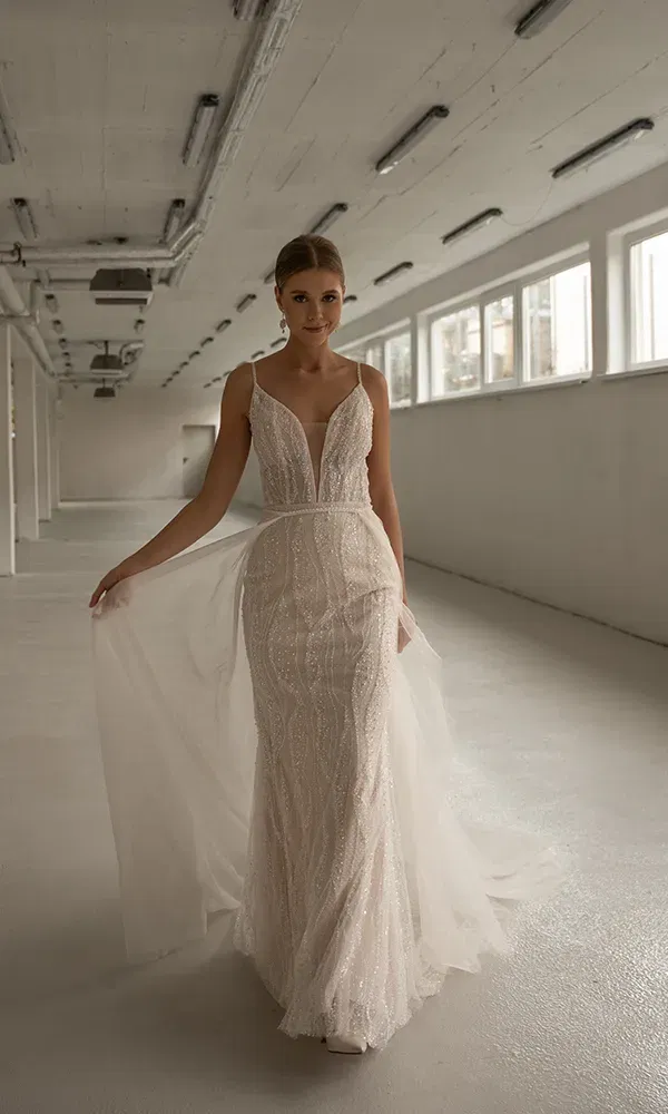 So bezaubernd Schleppen auch aussehen: Beim Feiern und Tanzen können sie hinderlich sein. Nach dem Jawort lässt sich die Schleppe bei dem bezaubernden Kleid deshalb einfach abnehmen – und gibt dann den Blick auf ein Perlen- und Pailetten-besetztes Column-Dress frei.