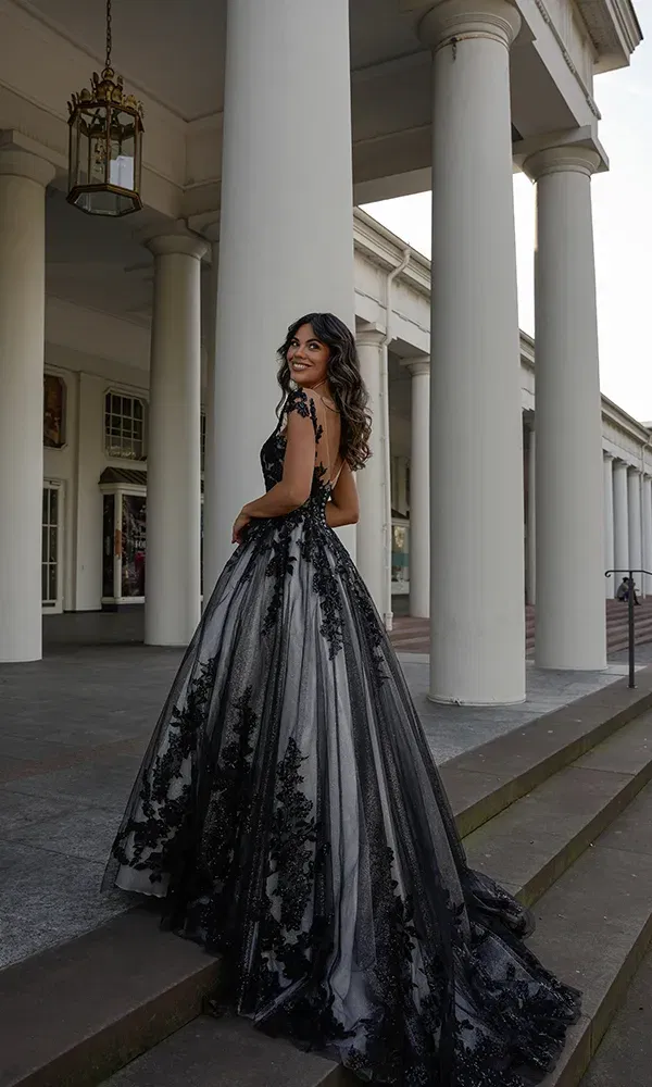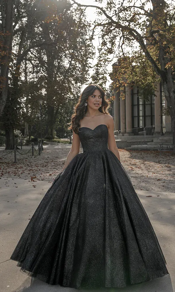 Während die Silhouette dieser weit schwingenden Princess-Robe an klassische Brautkleider erinnert, macht die Farbwahl den Unterschied: tiefschwarz und spektakulär schimmernd sorgt dieser Look für den ganz großen Auftritt.