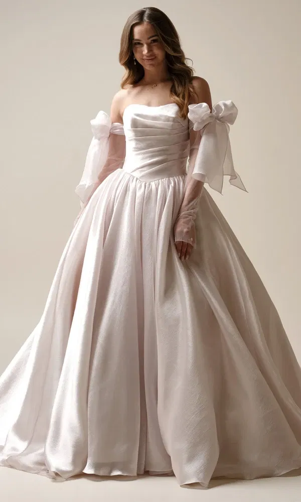 Bild links: Go big or go home! Das Modell Paris von MAGGIE SOTTERO kombiniert die Fülle eines Ballkleids mit zarten Schleifen an den Ärmeln – glamourös und romantisch zugleich.