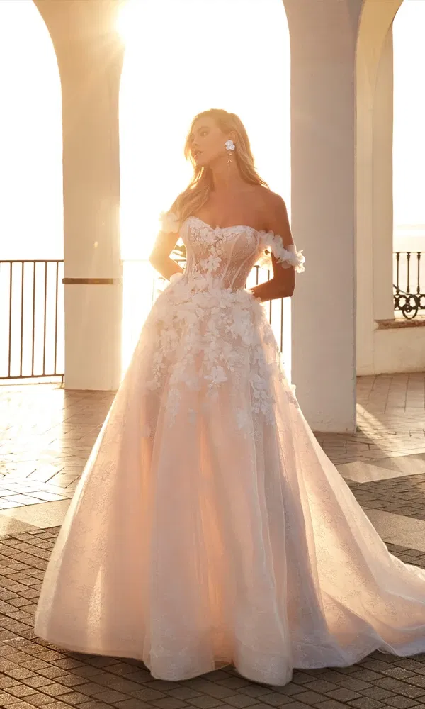 Bild rechts: Die markanten Schultern mit filigranen Blüten machen das Modell Golden von MODECA zum absoluten Blickfang.