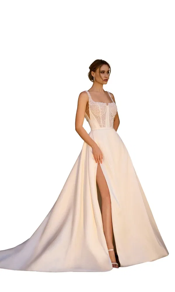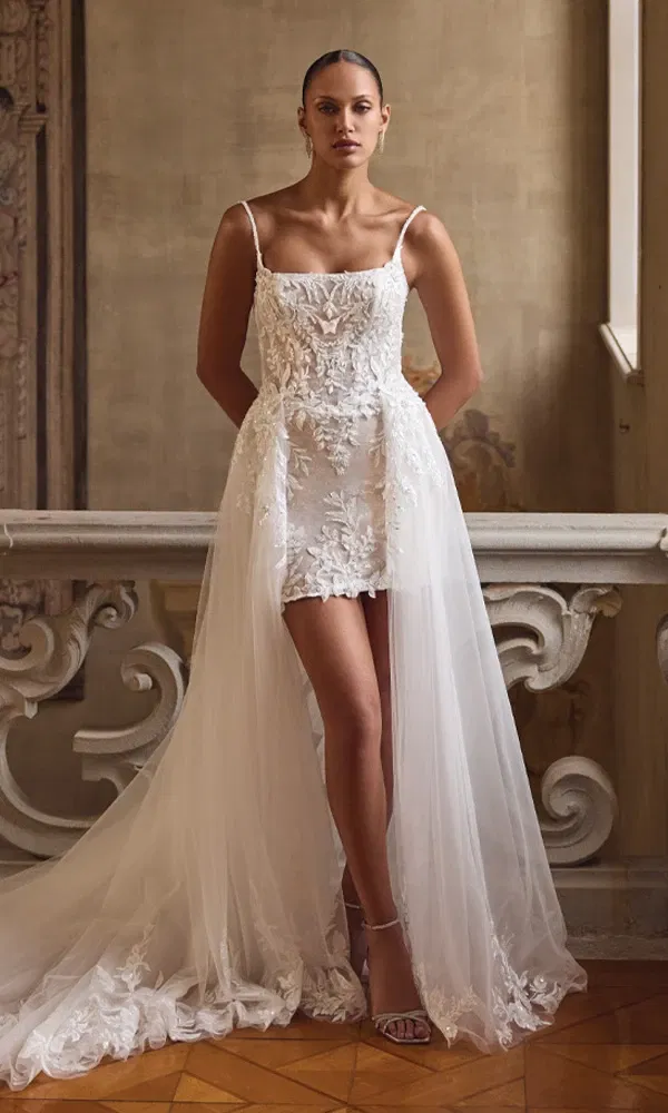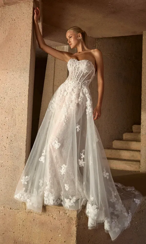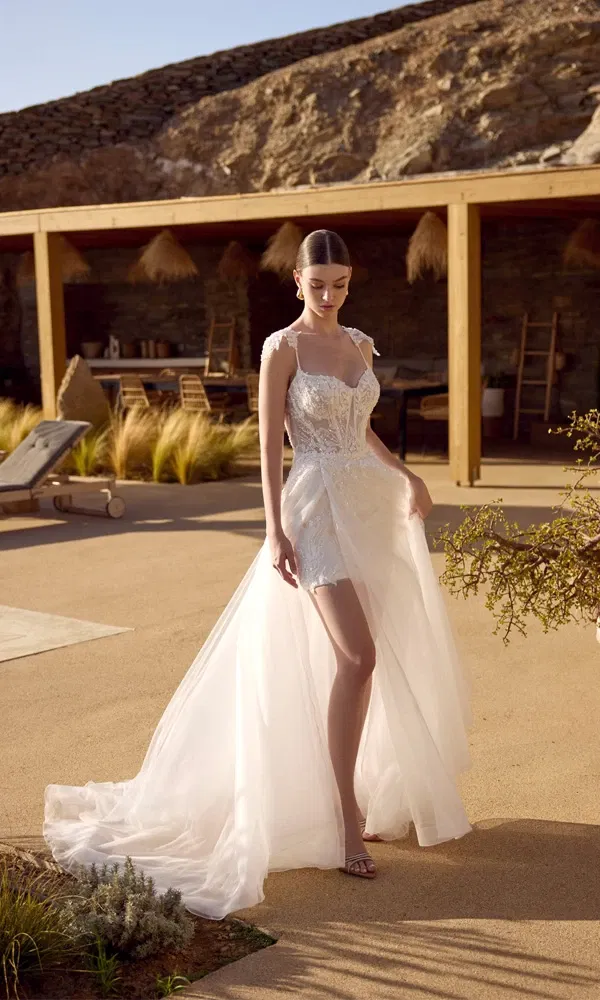 Transparente Oberteile sind der Inbegriff von Eleganz und Sinnlichkeit. Spitze, zarte Tülllagen oder dezente Illusionsstoffe lassen die Haut subtil durchscheinen und verleihen eurem Look einen verführerischen, aber stilvollen Touch. Ob florale Applikationen oder schimmernde Glitzersteinchen – dieser Trend passt perfekt zu mutigen Bräuten, die Tradition mit einem Hauch von Glamour brechen möchten.