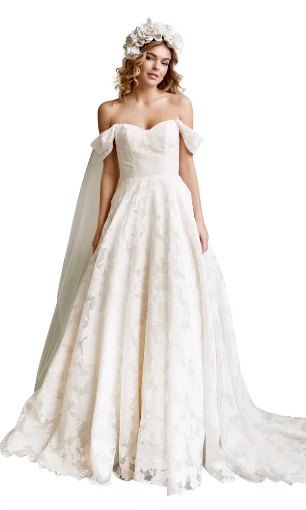 Bild links: Dieses Brautkleid von Rosa Clará besticht durch ein besonders grobes Spitzenmuster und trendige Schulterakzente.