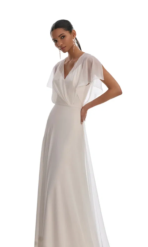 Chiffon ist ein leichter, transparenter Stoff. Hochzeitsmoden-Designer lieben an ihm vor allem seinen feinen, weichen Griff und seinen zarten Fall. Kein Wunder, dass sie Chiffon für die Kollektionen 2025 als einen Lieblingsstoff entdeckt haben. Er schafft einfach eine traumhafte Silhouette.