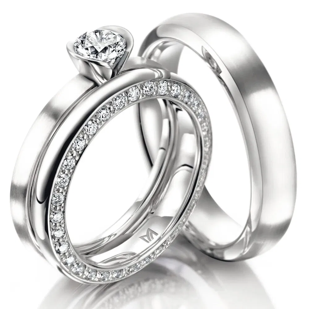 Bild rechts: Diese eleganten Trauringe von Meister haben ein mattes Finish, wodurch die Diamanten im Damenring besonders zur Geltung kommen.