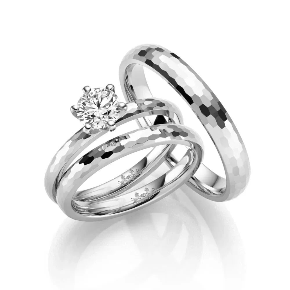 Wer einen kühleren und auch dunkleren Farbton für die Eheringe favorisiert, sollte sich weitere Materialoptionen ansehen, zum Beispiel Titan und Tantal. Titan ist zwar kein Edelmetall, aber ein sehr starkes und zugleich wunderschön weiß-graues Material. Neben seiner hohen Härte ist Titan auch hypoallergen und eignet sich dadurch besonders für Menschen mit empfindlicher Haut. Tantal wiederum ist ein dunkelgrauer, schwerer Werkstoff. Diamanten werden durch den dunklen, geheimnisvollen Farbton besonders schön in Szene gesetzt. Ringe aus Titan oder Tantal sind jedoch nicht in der Ringgröße erweiterbar.