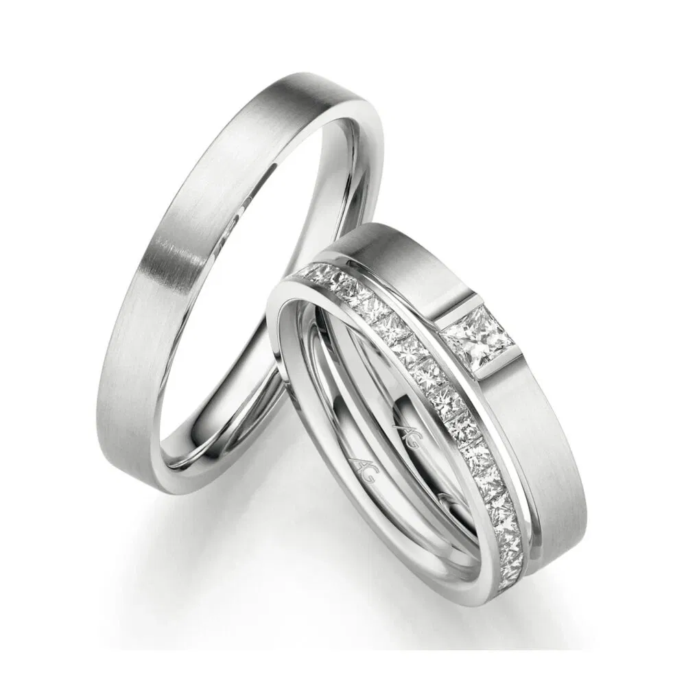 Platin gilt als eines der wertvollsten und haltbarsten Edelmetalle für Trauringe. Es ist dichter und schwerer als Gold und bekannt für seine antiallergischen Eigenschaften, was es ideal für Menschen mit empfindlicher Haut macht. Platinringe behalten ihre Farbe ein Leben lang