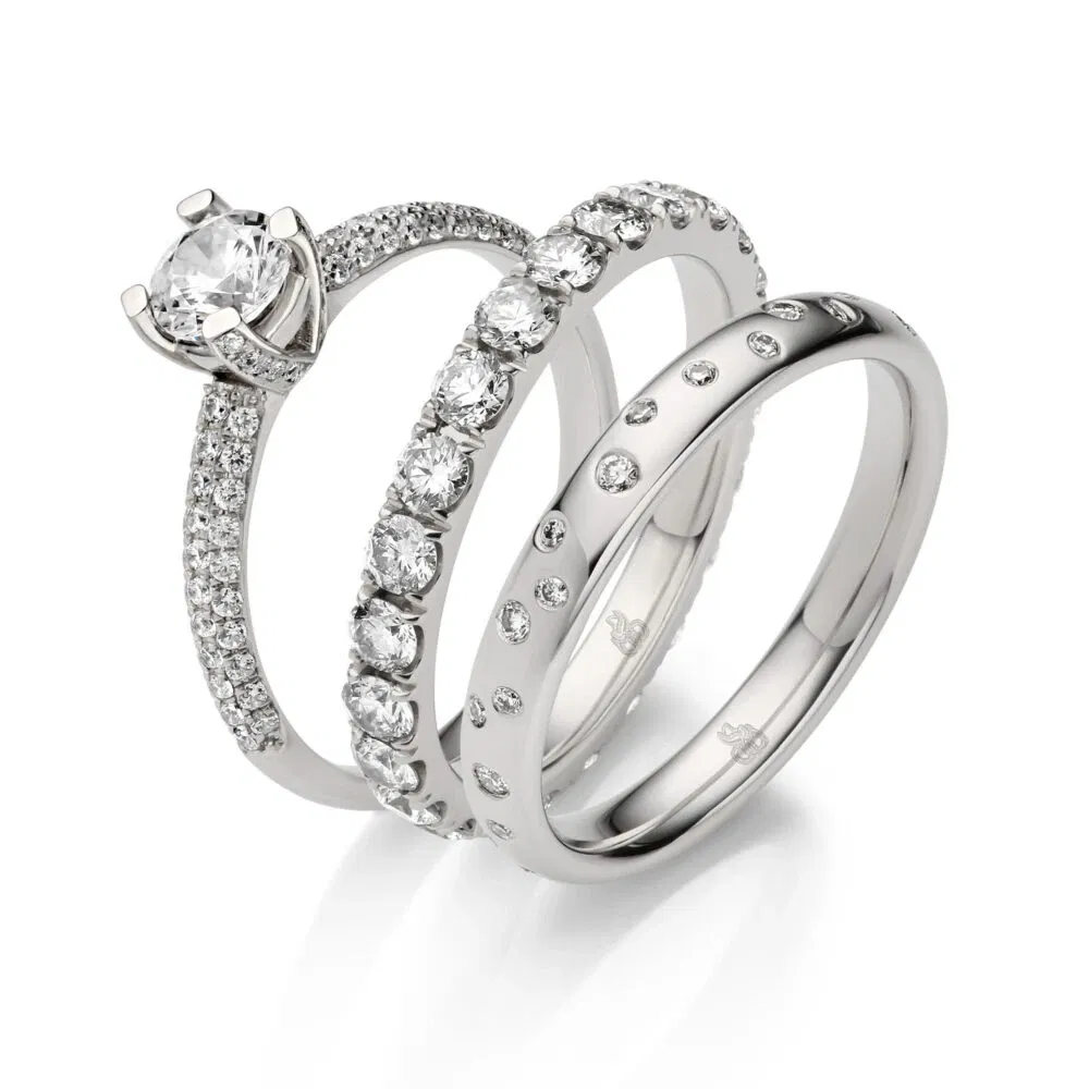 Bild rechts: Diese drei Ringmodelle von Rauschmayer können Antrags-, Ehe- oder Memoire-Ring sein.
