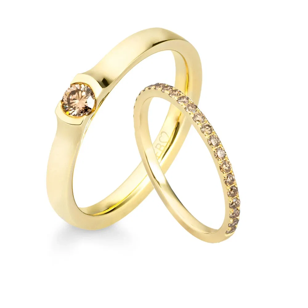 Bild links: Zimtfarbene Diamanten in den beiden Schmuckstücken von Breuning: einmal als Solitär und einmal als Memoire-Ausführung.