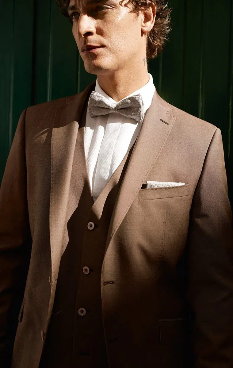 Der braune Anzug aus der Ceremony-Kollektion zeigt, wie harmonisch Anzug und Weste Ton-in-Ton wirken. Eine elegante Brokat-Fliege und das passende Einstecktuch setzen stilvolle Highlights.