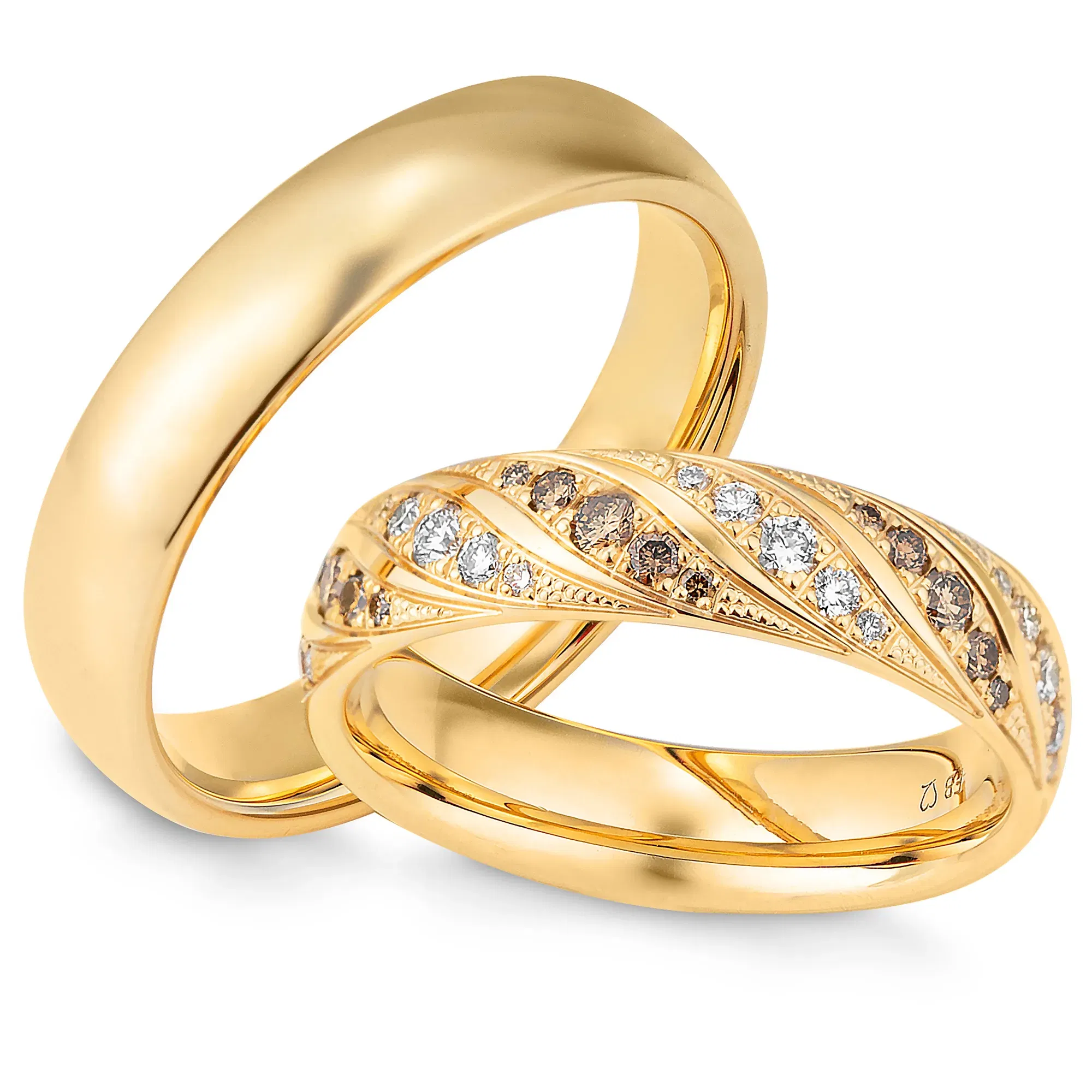 Die gelbgoldenen Trauringe von Breuning zeichnen sich durch ihren verspielt anmutenden Charakter aus. 35 wellenförmig angeordnete weiße und zimtfarbene Brillanten bilden ein harmonisches Zusammenspiel und verwandeln den Ring zu einem eleganten Highlight in 18 Karat Gold.
