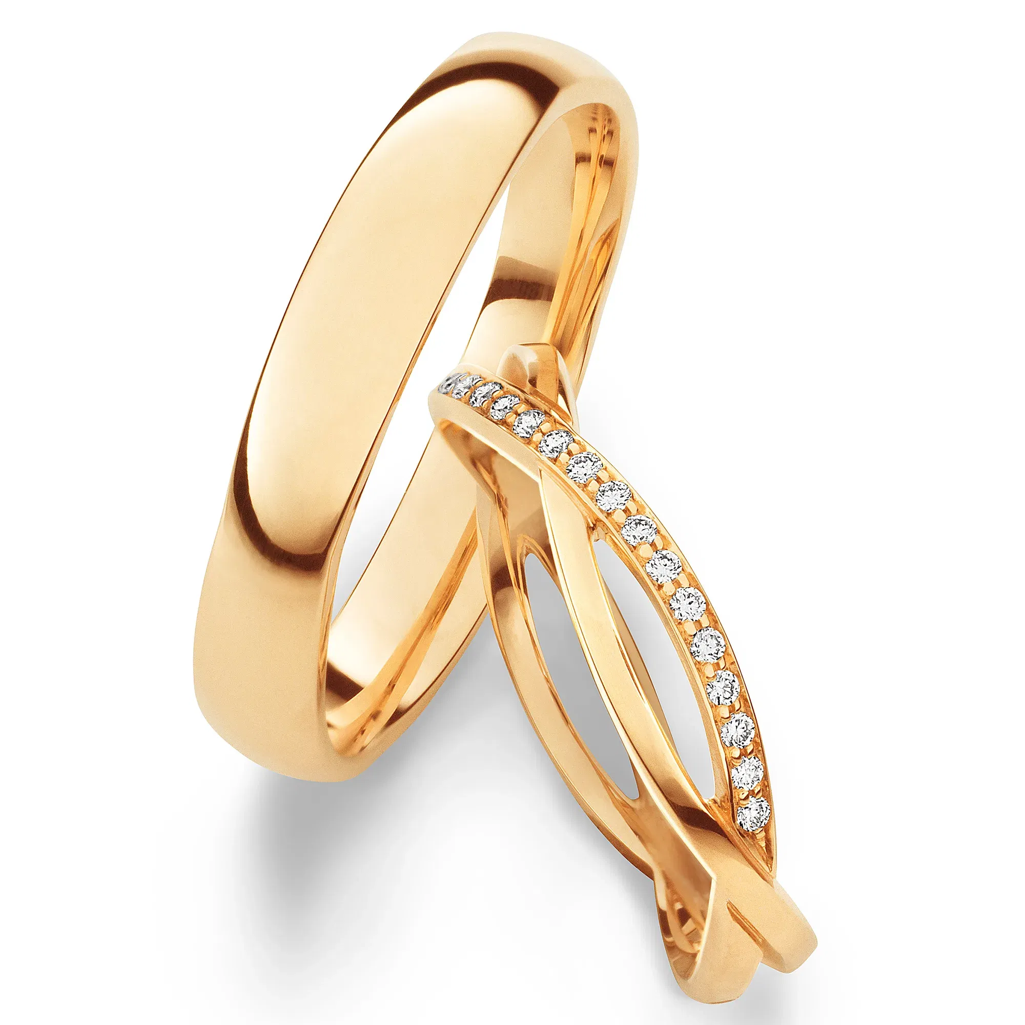 Dieses romantisch verschlungene Trauringpaar von Max Kemper in Roségold symbolisiert die tiefe Verbundenheit zwischen zwei Menschen. Der Damenring besteht aus zwei ineinanderfließenden Ringschienen, die filigran mit 21 Brillanten im Verschnitt gefasst sind. Dieses Modell kann sowohl als Schmuckring als auch als Trauring getragen werden.