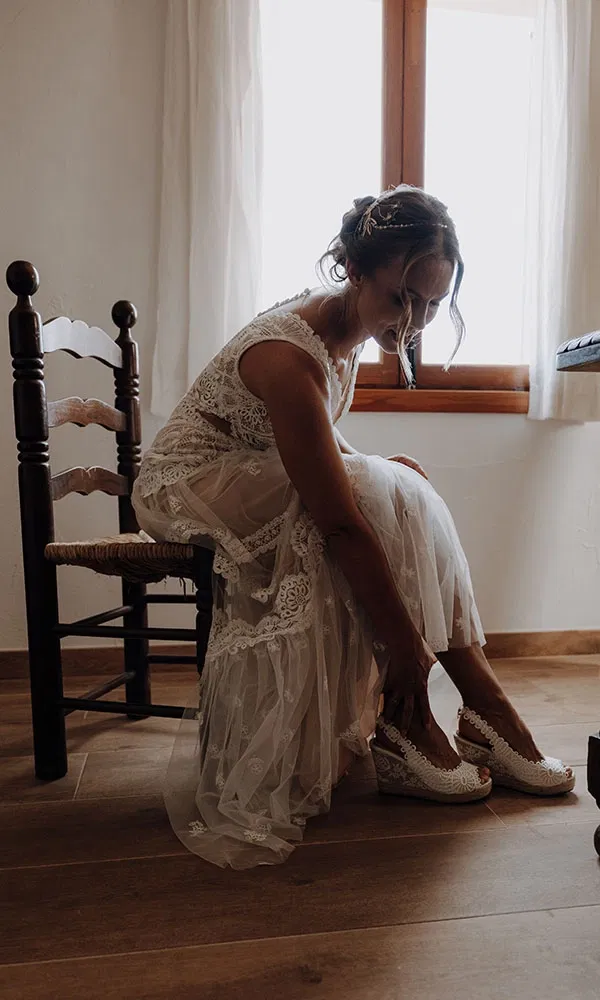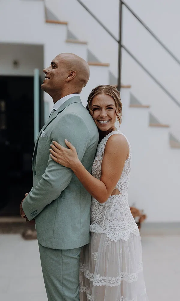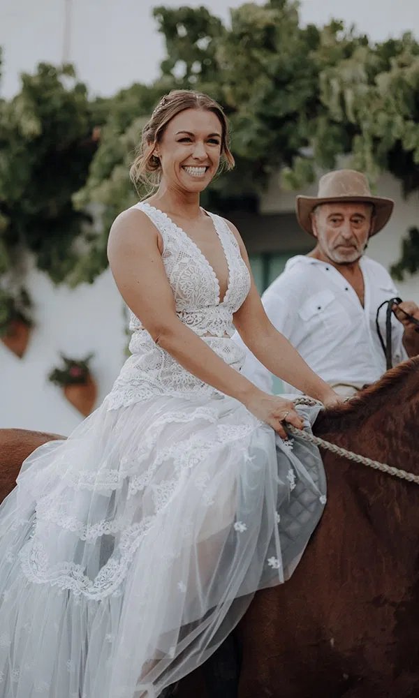Die Suche nach dem perfekten Brautkleid führte Eva zunächst in ein Boho-Brautmodengeschäft – doch ihr Traumkleid fand sie schließlich woanders. „Am Vormittag probierte ich bestimmt 30 Kleider an“, erzählt sie. „Schon das zweite gefiel mir richtig gut – ein klassisches Fit-and-Flare-Modell. Wir haben es sogar schon reserviert.“ Nach einem Mittagessen stand jedoch noch ein weiterer Termin an und der sollte alles verändern. Im zweiten Geschäft, Somnis Mediterran, entdeckte Eva eine ganz andere Welt: „Die Kleider dort waren außergewöhnlich, leicht, mit einem Hauch Boho – genau das, was ich immer mochte.“ Sie suchte sich fünf verschiedene Modelle aus, als die Verkäuferin plötzlich meinte, sie habe noch ein Kleid, das „anders“ sei. „Es war etwas dunkler und wirklich speziell. Ich ließ mich überraschen und als ich es anzog, wusste ich sofort: Das ist mein Kleid.“ Ursprünglich hatte das Kleid lange Ärmel und eine Schleppe, doch beides ließ Eva anpassen. „Ich wollte ein Kleid ohne Ärmel – wir heirateten im Juli und nicht in der Kirche und die Schleppe war mir zu unpraktisch“, erklärt sie. „Als sie abgeschnitten wurde, gefiel mir das Kleid sogar noch besser. Ich konnte mich frei bewegen, tanzen und es blieb bis zum nächsten Tag perfekt sauber. Es war einfach das ideale Kleid für mich.“