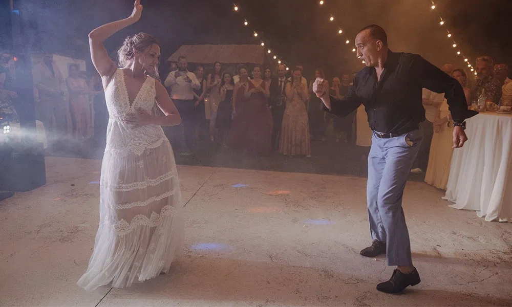Ein besonders emotionaler und zugleich fröhlicher Moment war das Mitternachtsritual, das Eva aus ihrer Heimat Österreich mitgebracht hatte. „Bei uns ist es Tradition, dass die Braut um Mitternacht symbolisch keine Braut mehr ist, sondern zur Ehefrau wird“, erklärt sie. „Normalerweise wird dabei der Brautkranz oder der Schleier abgenommen – das markiert den Übergang in die Ehe.“ Auf Mallorca gestalteten Eva und Tana diesen Brauch auf ihre eigene, moderne Weise. „Wir haben es etwas vereinfacht: Alle Männer tanzten mit der Braut, alle Frauen mit dem Bräutigam – begleitet von typischer österreichischer Musik“, erzählt sie.