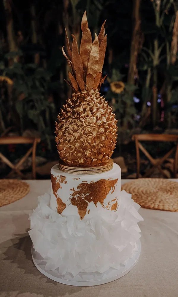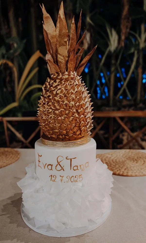 Ein echter Hingucker auf der Feier war die außergewöhnliche Hochzeitstorte. „Die Ananastorte war etwas ganz Besonderes“, erzählt Eva. „Sie hatte drei Ebenen: unten Rüschen, in der Mitte eine Weltkarte mit Stecknadeln, die all unsere gemeinsamen Reiseziele markierte, und oben thronte eine kunstvolle Ananas.“ Die Details waren ebenso beeindruckend wie die Idee selbst: „Die Ananas war gefüllt mit Orangen-Pistazien-Creme und Biskuit, außen weiße Schokolade, mit Gold besprüht und die Blätter waren aus essbarem Papier.“ Statt eines klassischen Anschnitts entschieden sich Eva und Tana für eine symbolische Geste. „Wir haben kein Stück abgeschnitten, sondern gemeinsam ein Blatt aus der Ananas herausgepickt“, erzählt sie. „Rund um die Torte stand ein süßer Tisch mit kleinen Desserts, unter anderem Mini-Ananas mit dem gleichen Geschmack wie die große Torte.“ „Die Ananas selbst haben wir am nächsten Tag beim After-Wedding aufgeschnitten. Das war der perfekte Abschluss.“