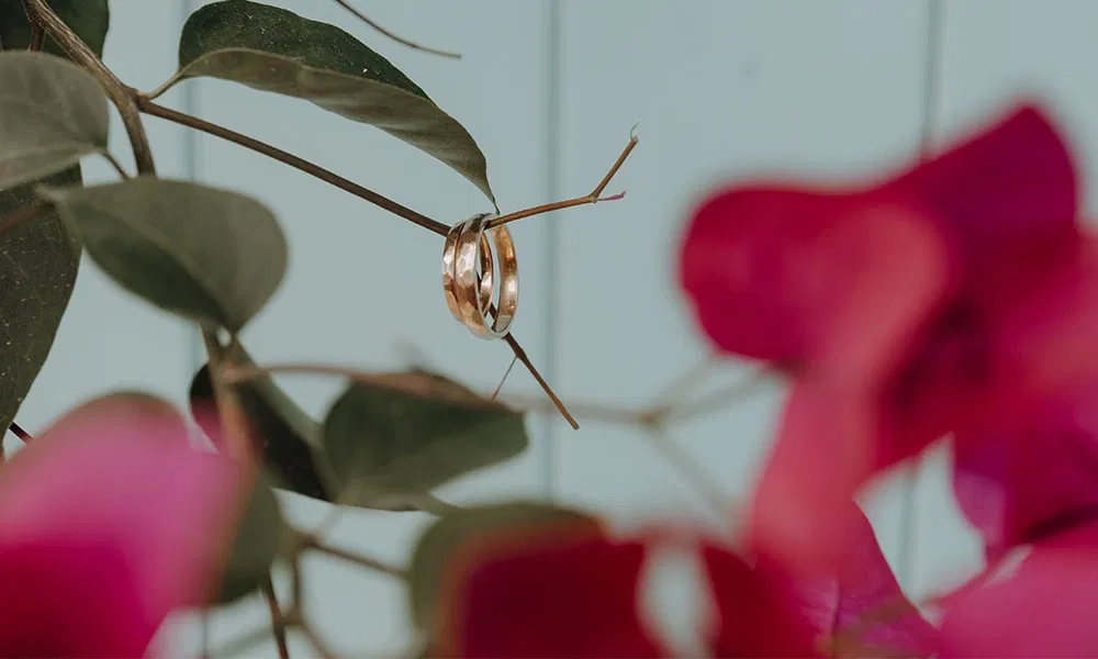 Die Eheringe von Eva und Tana erzählen eine ganz persönliche Geschichte. „Unsere Ringe ließ ich beim Juwelier Fernando Miro anfertigen – aus eingeschmolzenem Familienschmuck“, erzählt Eva. „Darin stecken meine alten Kinderohrringe in Katzenform, ein Pferdeanhänger aus Gold und einige Stücke von meiner Oma.“ Auf die Idee brachte sie der Juwelier selbst, den das Paar auf einer Hochzeitsmesse kennenlernte. „Er meinte, wir könnten unser eigenes Gold verwenden.“ Nicht nur ihre eigenen Ringe entstanden aus dem alten Schmuck: Eva ließ auch für ihre Mutter einen besonderen Ring anfertigen. „Den habe ich ihr am Hochzeitstag geschenkt, als wir uns gerade fürs Styling fertig machten. In diesem Ring steckt etwas von mir, von ihr und von meiner Oma, die leider nicht mehr lebt. Das war ein sehr emotionaler Moment.“