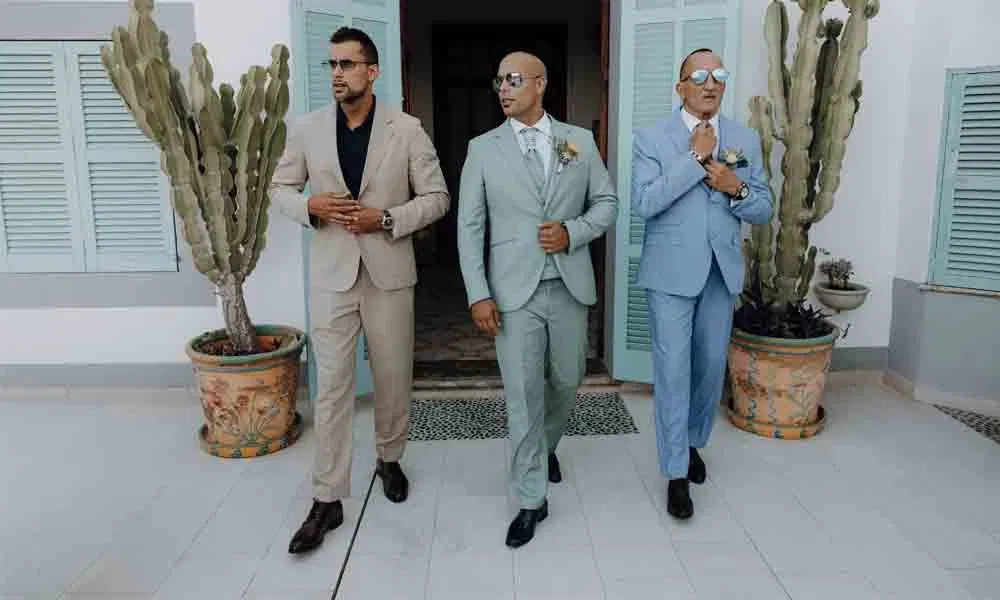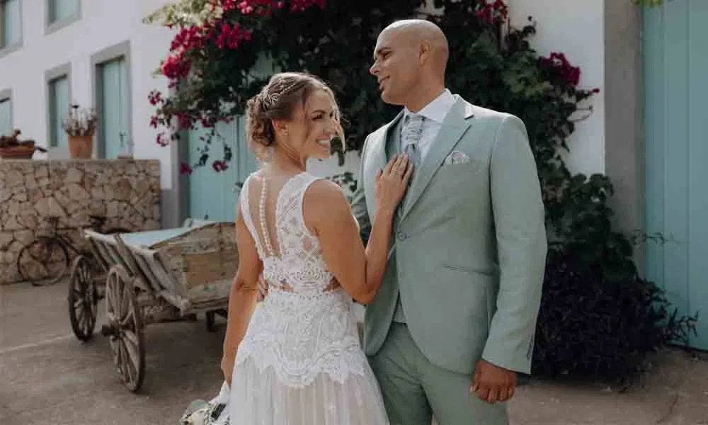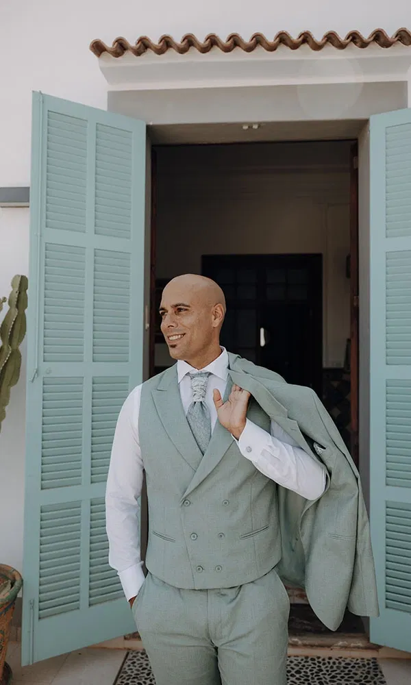 Auch Tanas Outfit hatte eine besondere Geschichte. „Eigentlich war ich es, die den Kontakt herstellte“, erzählt Eva lachend. „Da mein Brautkleid bei Somnis Mediterran recht speziell war, fragte ich die Verkäuferin, wo denn der Bräutigam seinen Anzug kaufen könne. Sie empfahl mir daraufhin einen Schneider namens Domingo.“ Tana übernahm ab da die Auswahl selbst, denn Braut und Bräutigam wollten sich am Hochzeitstag gegenseitig überraschen. „Er ging allein zu Domingo und das war genau die richtige Entscheidung“, sagt Eva. „Der Schneider hat ein großartiges Gespür für Stil.“ Tana hatte bereits eine grobe Vorstellung: „Er wollte etwas in Olivgrün – es wurde schließlich ein Anzug in einem eleganten, grünlich-türkisen Ton. Der Look passte perfekt zu unserer sonnigen Mallorca-Hochzeit.“