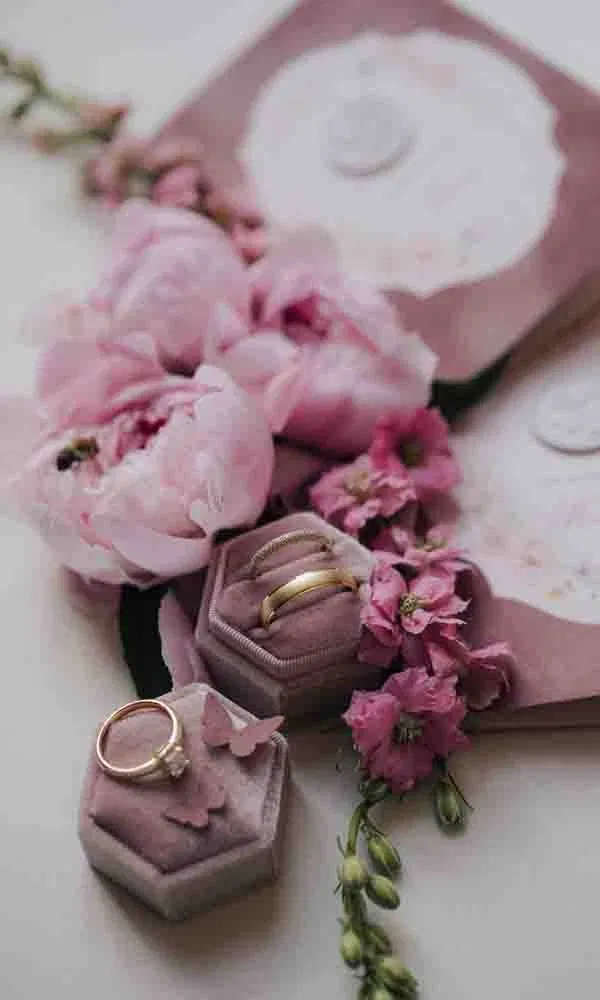 Präsentiert eure Trauringe in romantischen, sechseckigen Samtboxen. Schön ist es, wenn die Motive des Logos und der Einladungen sich auch auf dem Kästchen wiederholen.
