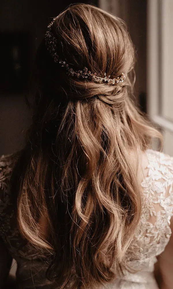 „Wow, jetzt bin ich erwachsen, haha… Aber Spaß beiseite: Wow! Normalerweise trage ich nie Make-up, aber die Visagistin hat es sehr natürlich hinbekommen. Ich war ganz ich selbst, aber in einer besonderen Version. Meine Haare sahen wirklich fantastisch aus. Auf meinem Pinterest-Board habe ich ein Foto von einer ähnlichen Brautfrisur gespeichert und ohne es zu wissen, hat die Visagistin genau das getroffen, was ich mir erträumt habe. Ich durfte einige schöne Hochzeitsoutfits anprobieren, aber das Spitzenkleid rief förmlich meinen Namen. Von den Ärmeln bis hin zum tiefen Rücken, ich war schockverliebt!“