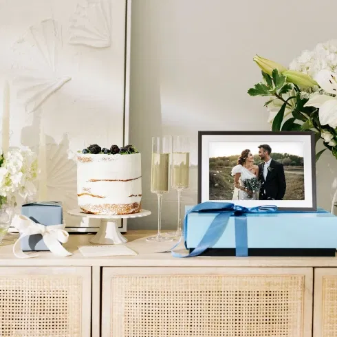 Der digitale Fotorahmen für Hochzeitsfotos passt in jedes Zuhause und zeigt, was wirklich zählt: gemeinsame Erinnerungen an euren großen Tag.