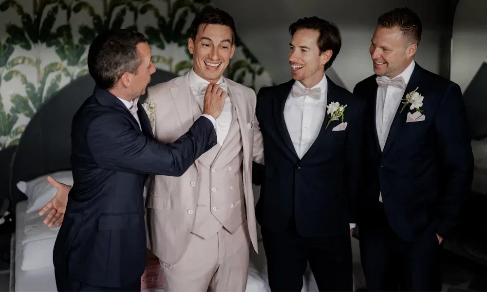 Das Getting-ready wird noch besser, wenn deine Groomsmen von Anfang an dabei sind. Schon der gemeinsame Anzugkauf schweißt zusammen und am Hochzeitstag sorgt das gemeinsame Fertigmachen für gute Stimmung und unvergessliche Erinnerungen.