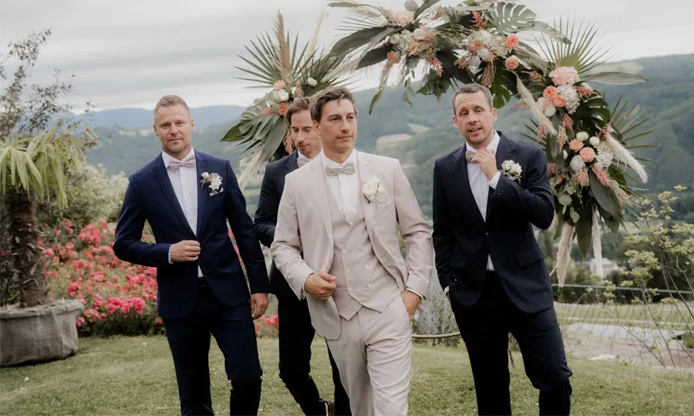 - Zum perfekten Hochzeitslook: Deine Groomsmen stehen dir nicht nur beratend zur Seite, wenn es um die Auswahl deines perfekten Hochzeitsanzugs geht, sondern sorgen auch dafür, dass ihre eigenen Outfits zum Stil der Hochzeit passen. Ob ihr euch für einen Anzug aus der gleichen Kollektion entscheidet oder lediglich für abgestimmte Accessoires wie Krawatten, Boutonniere und Einstecktücher, ist euch überlassen. Der Anzugkauf wird zu einem unvergesslichen Erlebnis – gemeinsam stöbert ihr durch die Geschäfte, tauscht Meinungen aus und erlebt diesen besonderen Moment zusammen. Manchmal wird der Shopping-Tag sogar mit einem Gin-Tasting abgerundet, was dem Ganzen eine entspannte und stilvolle Note verleiht.
