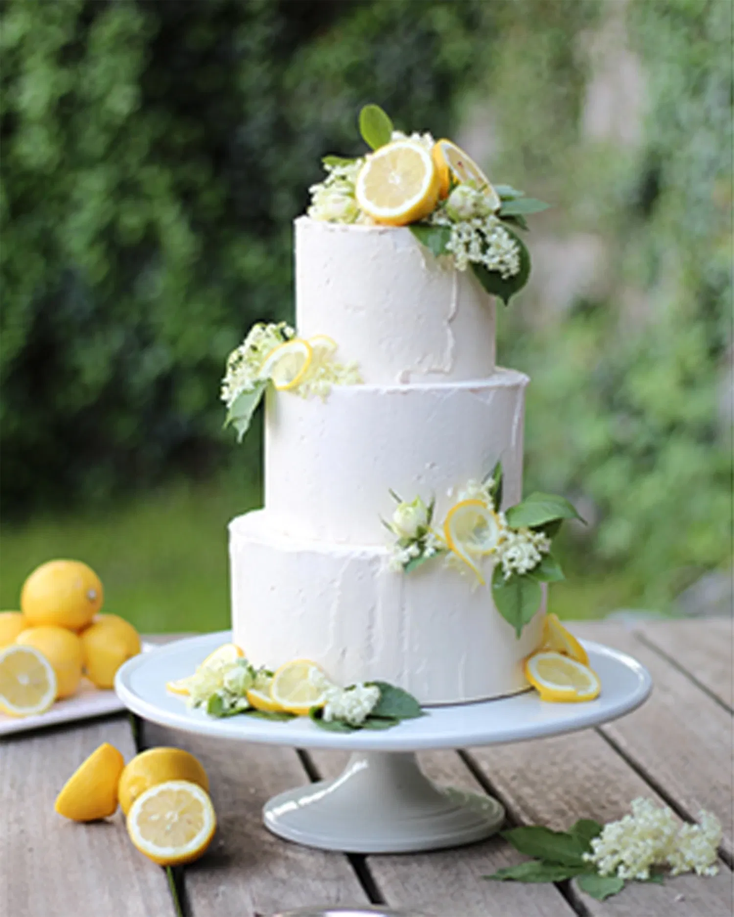 In die unteren beiden Stöcke jeweils 3 bis 5 in der Länge zugeschnittene Buchenholzstäbe stecken, um ein Einsinken zu verhindern. Die Torten aufsetzen und mit frischen Holunderblüten, Zitronenhälften und Zitronenscheiben dekorieren.