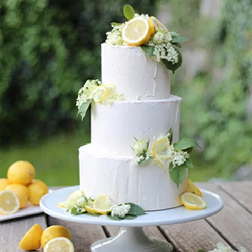 In die unteren beiden Stöcke jeweils 3 bis 5 in der Länge zugeschnittene Buchenholzstäbe stecken, um ein Einsinken zu verhindern. Die Torten aufsetzen und mit frischen Holunderblüten, Zitronenhälften und Zitronenscheiben dekorieren.
