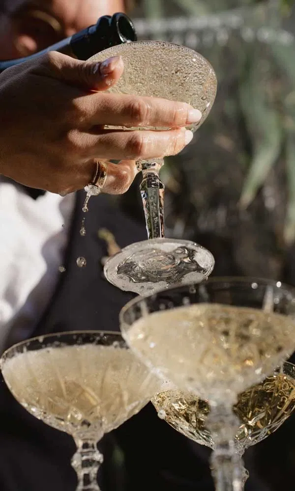 Ein leichter Aperitif mit Champagner oder Prosecco passt gut zur Day Wedding. Drinks wie Bellini, Mimosa, Hugo oder Aperol Spritz sind tagsüber beliebt, weil sie frisch und leicht sind. Alkoholfreie Alternativen wie Traubensecco, Kombucha, Tonic mit Rosmarin oder leichte Sirupe mit Frucht- oder Kräuterextrakten geben allen Gästen ein festliches Gefühl. Ihr könnt beide Getränkevarianten kombinieren: Erst der Empfang mit perlendem Sekt, danach vollmundiger Kaffee zum Dessert. Oder umgekehrt: ein sanfter Start mit Cappuccino, später eine prickelnde Runde zum Anstoßen.