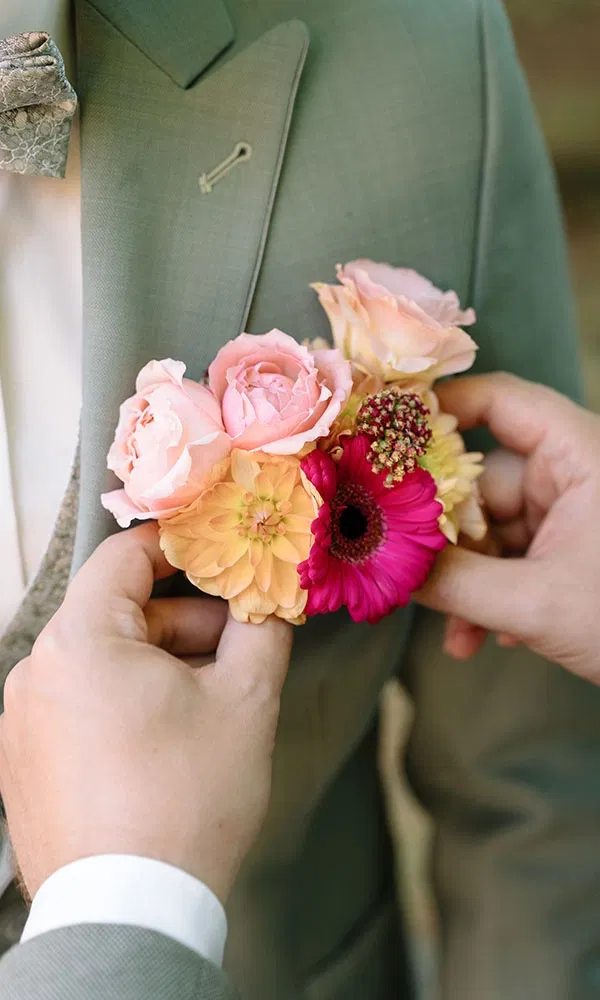 Eine Corsage am Anzug ist der kleine, aber feine Blumenschmuck, der am Revers oder an der Brusttasche befestigt wird. Oft auch als Ansteckblume oder Boutonnière bekannt, sorgt sie für den besonderen Touch und verleiht dem Outfit des Bräutigams Eleganz und Stil.