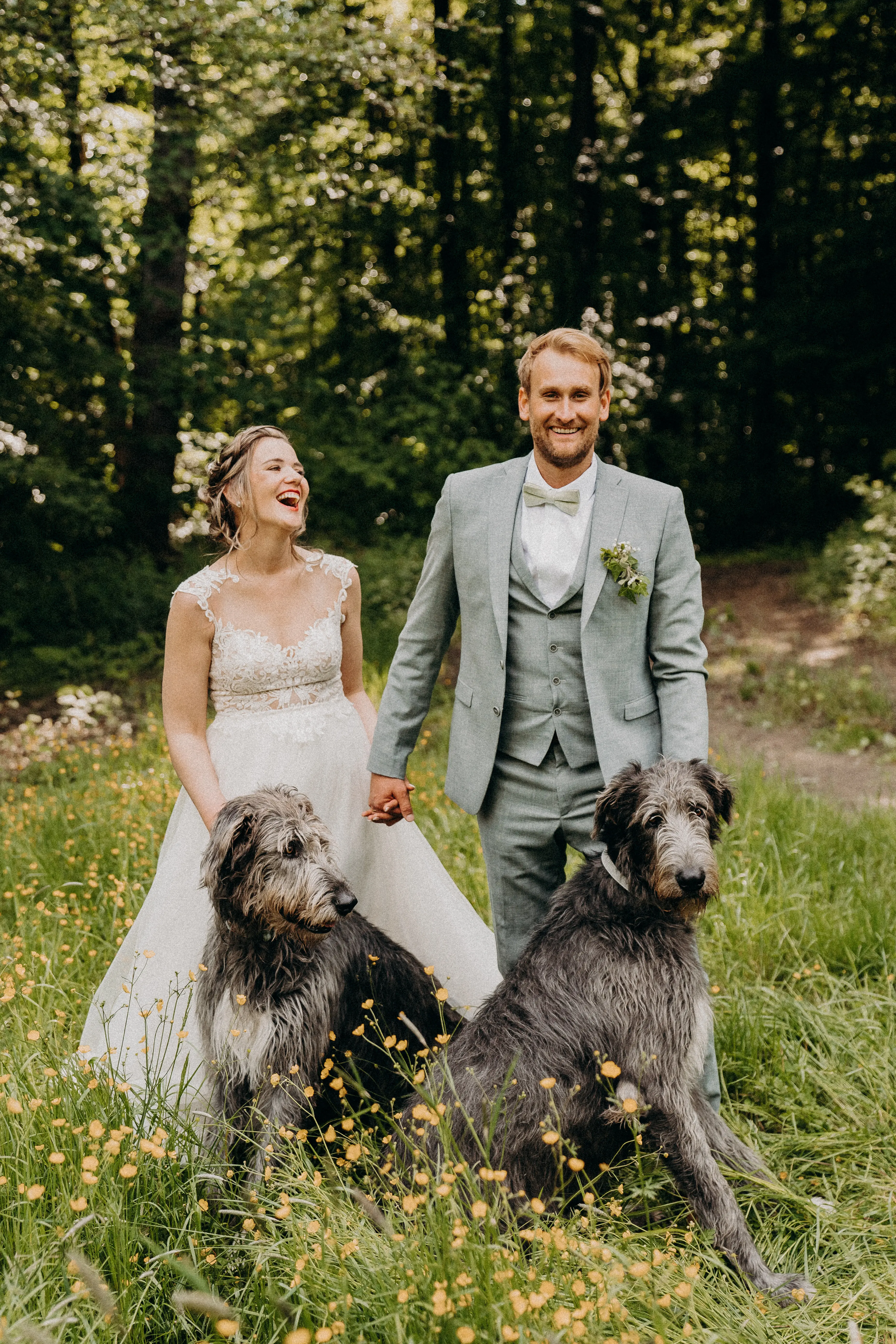 Beim Brautstraußwurf wollte Julia all ihre ledigen Freundinnen glücklich machen. Deshalb hatte sie insgesamt zwölf einzelne Sträußchen gebunden. „Leider trennten sich die Bouquets beim Werfen nicht, sodass alle Sträußchen in den Arm einer einzigen Freundin fielen“, lacht die Braut. Nach dem eindeutigen Zeichen des Schicksals verteilte die glückliche Fängerin die Blumen aber wie gedacht an die weiteren Mädels. Zur Eröffnung der Party tanzten Julia und Julian auf der Terrasse zu „The Mates of Soul“ von Taylor John Williams. Dabei erlebten sie ein Überraschungsmoment, den sie als ein Tageshighlight bezeichnen: „Unser Hund Odin wollte ‚mitkuscheln‘. Er sprang an uns hoch und legte seine Vorderpfoten auf unsere Schultern – genial“, freuen sich die beiden. Gegen 22 Uhr verlagerte sich die Feier nach drinnen. Zu bester Musik von DJ Emparé feierte die Gesellschaft bis halb fünf in den nächsten Tag hinein.