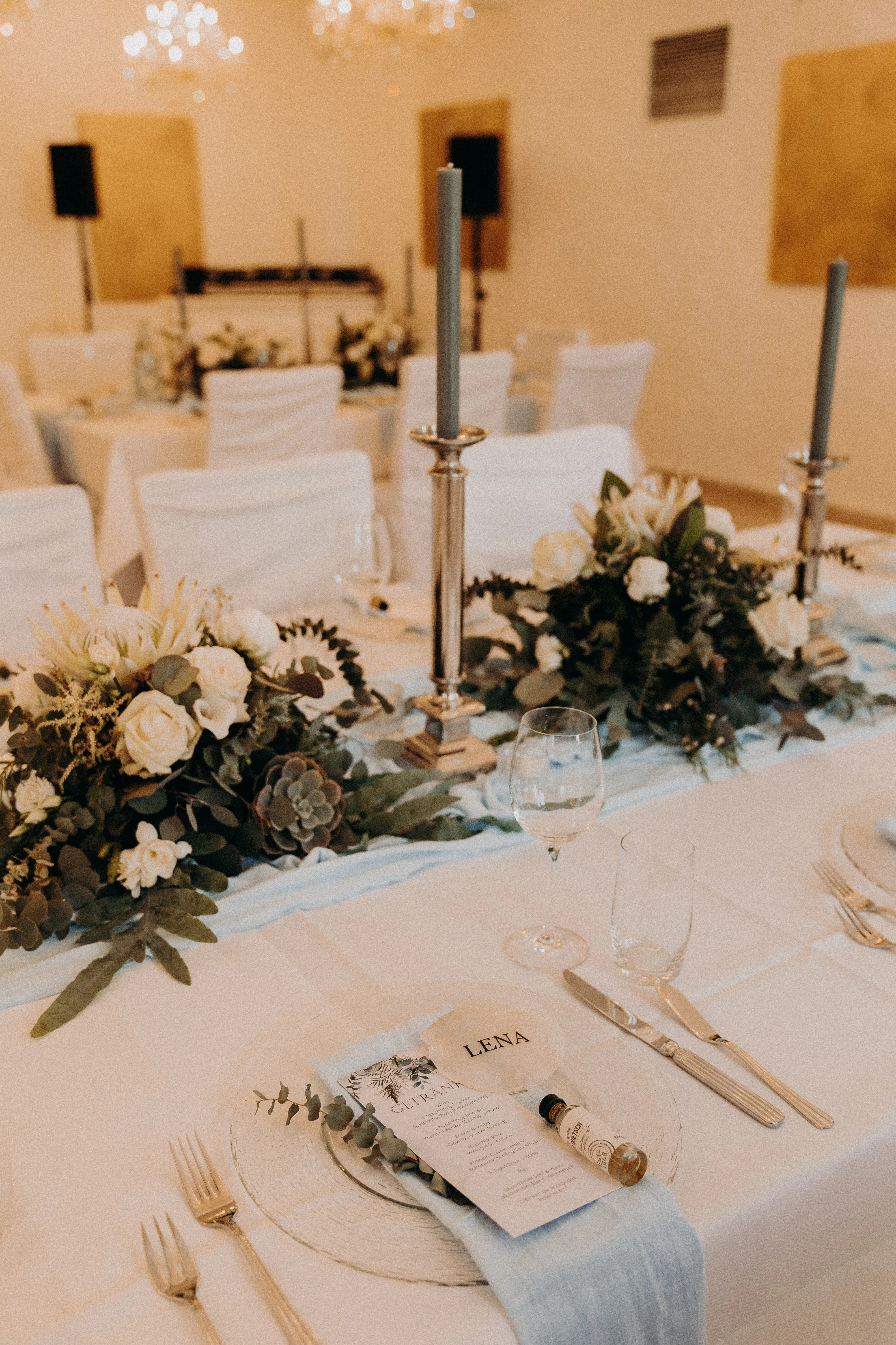 Bevor die anfänglichen Hochzeitsplanungen in die Tat umgesetzt werden konnten, funkte Corona dazwischen. Die Verbindung der beiden hielt der Krise nicht stand. Trotz ihrer Trennung kam ganz Aufgeben für beide nicht infrage. Durch eine Paartherapie fanden sie wieder zusammen. „Unsere Streitkultur war sehr ausbaufähig. Die gemeinsame Therapie heilte unsere Beziehung“, berichtet Julia. Während ihrer Schwangerschaft in 2022 nahm sie die Hochzeitsplanungen wieder auf. Die Location stand für sie schon seit jeher fest: „Vor etwa 40 Jahren kaufte mein Papa das Chausseehaus in Wiesbaden. Meine Geschwister und ich sind dort aufgewachsen. Für mich kam nie ein anderer Hochzeitsort infrage“, erklärt Julia. Im Mai 2023 war noch ein Feiertagstermin frei – perfekt für eine Frühsommerhochzeit.
